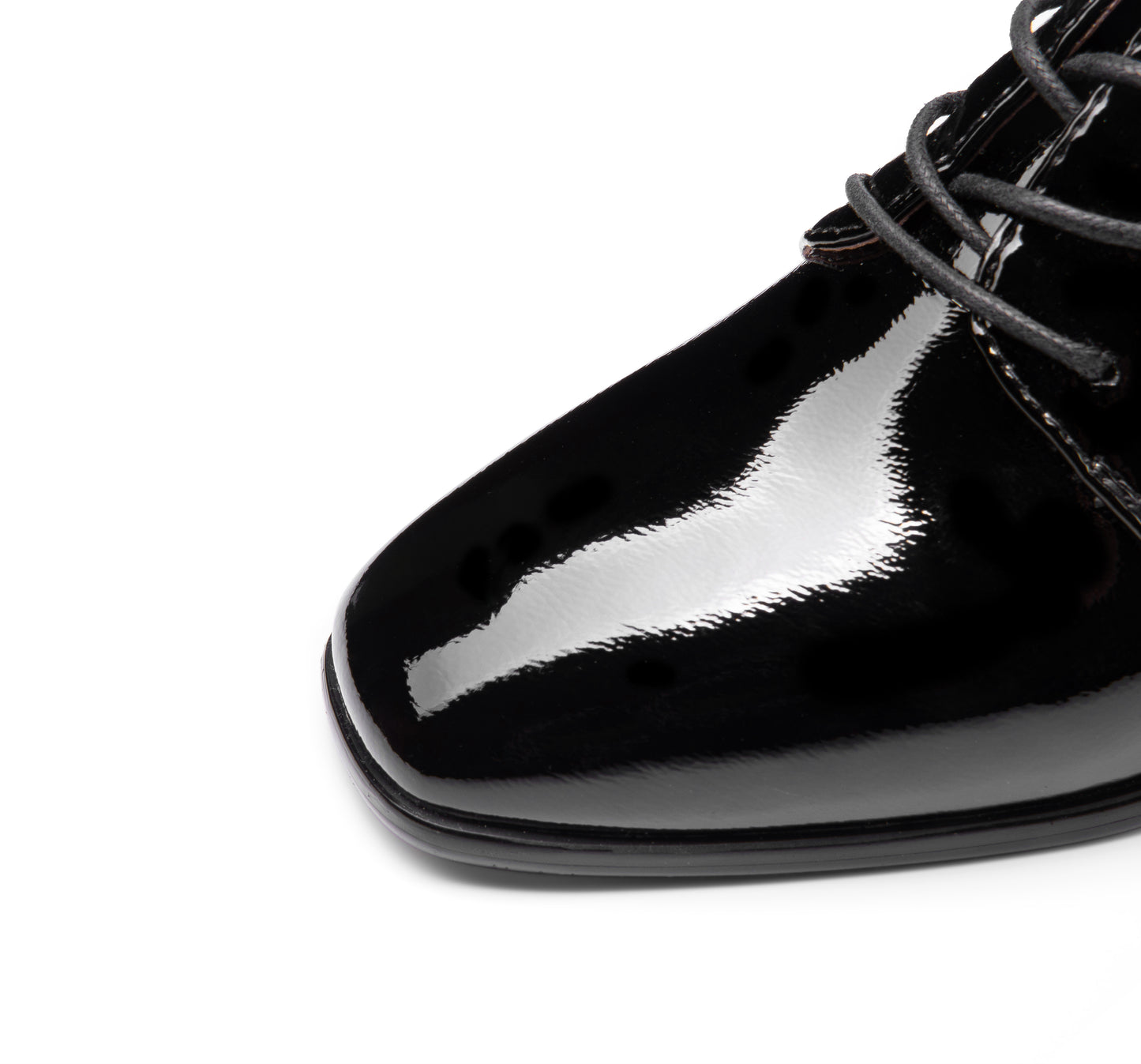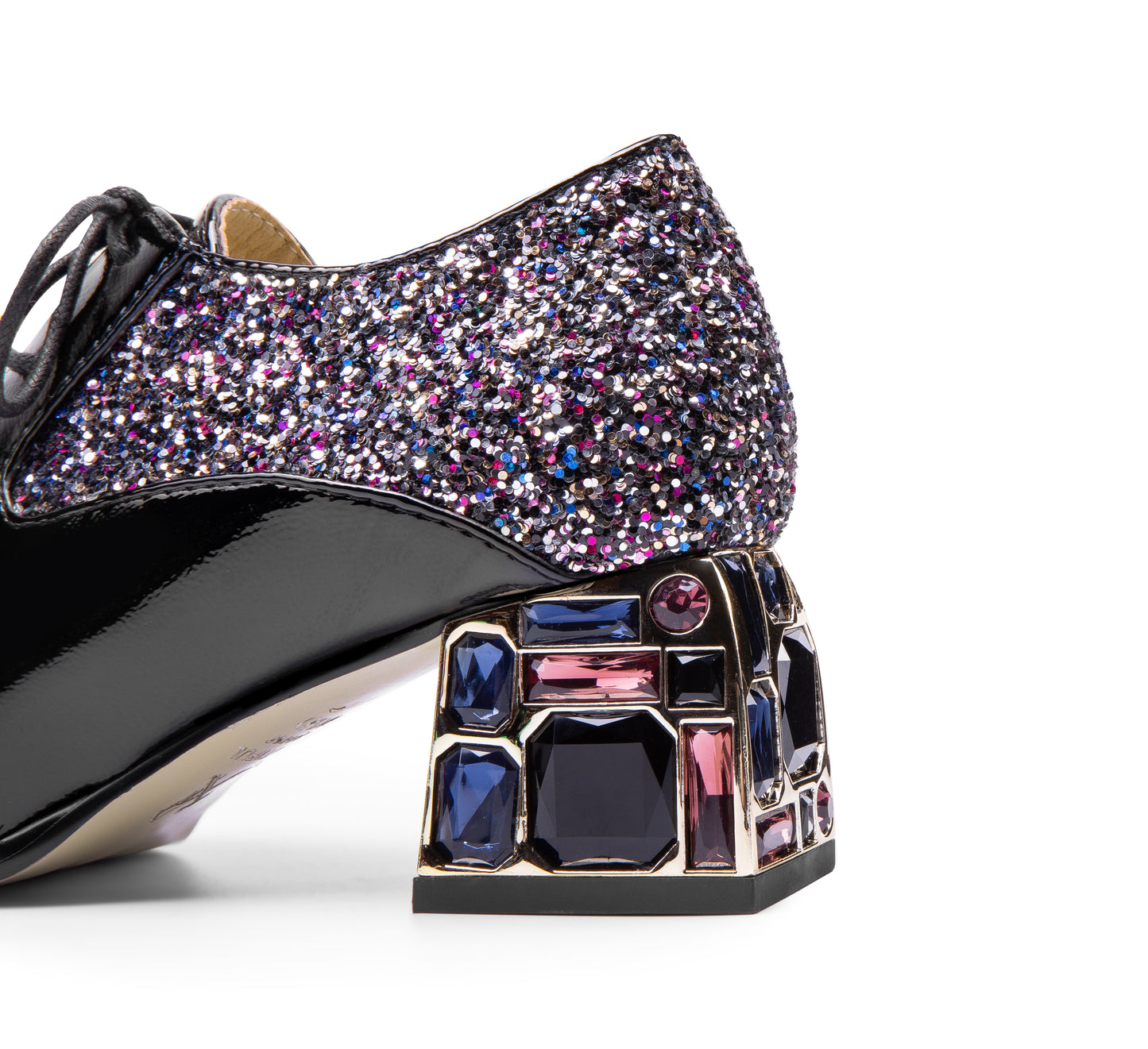 TinaCus Damen-Pumps aus glänzendem Lackleder, handgefertigt, klassisch, quadratische Zehenpartie, Kristall, mittelhoher Absatz, Schnürung, Glitzer-Dekor