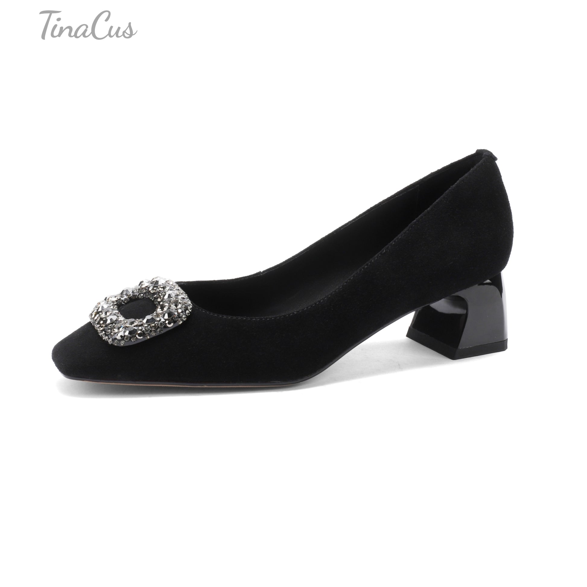 Soft suede leather pumps shoes designed with square toe, crystal buckle and chunky heels to keep up with fashion trend