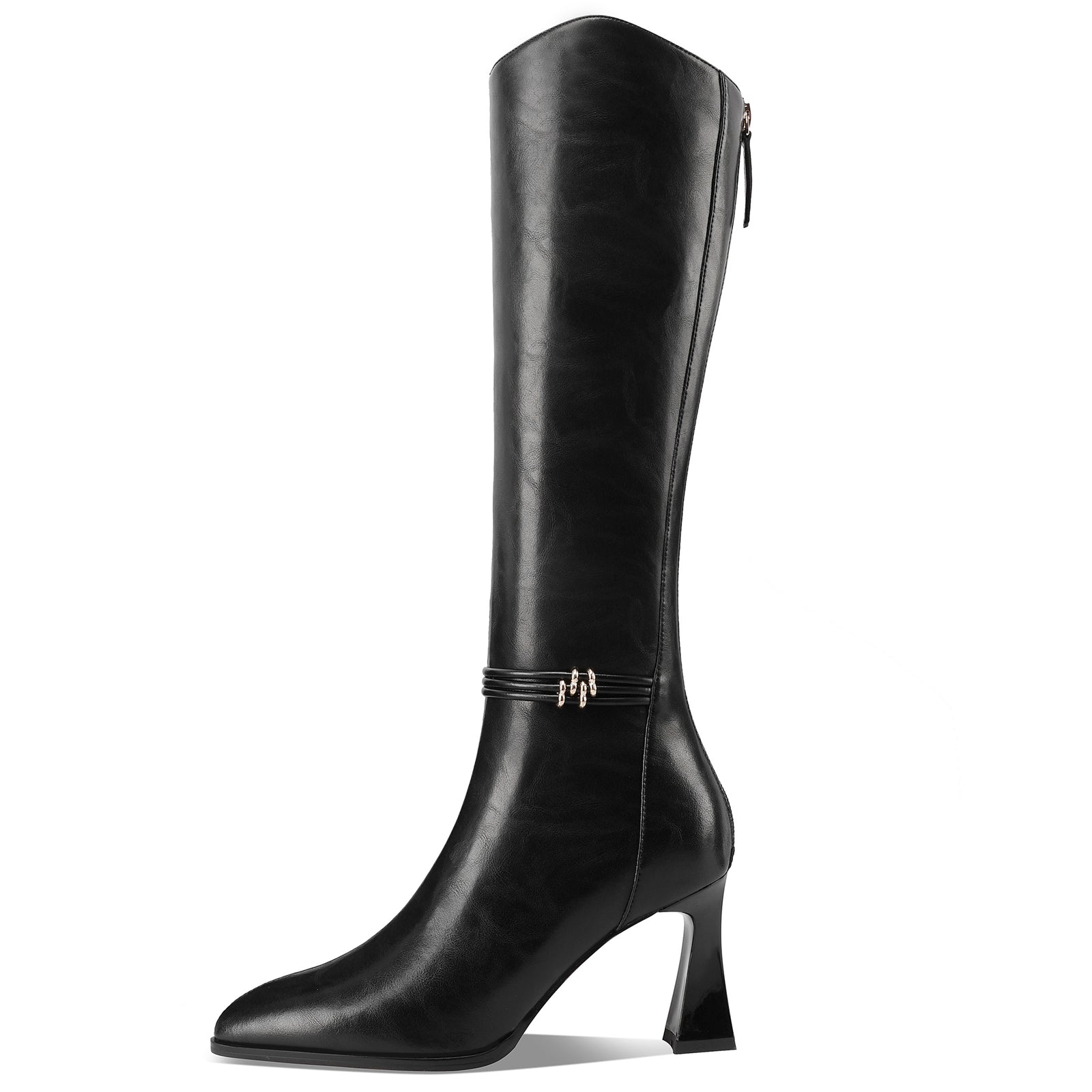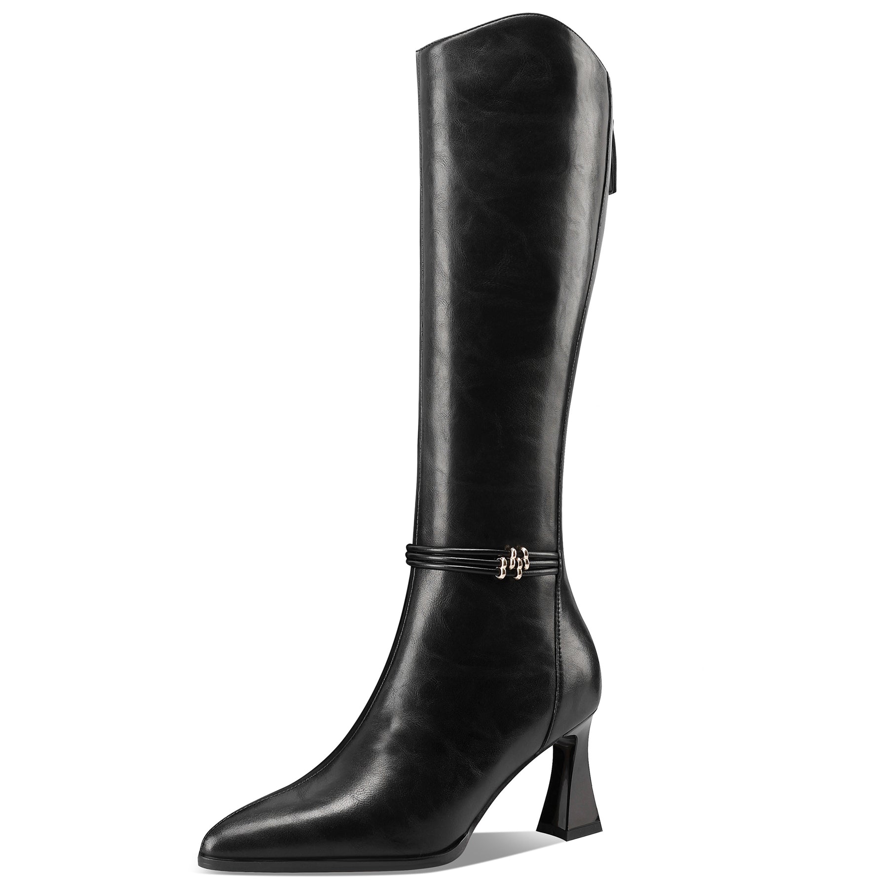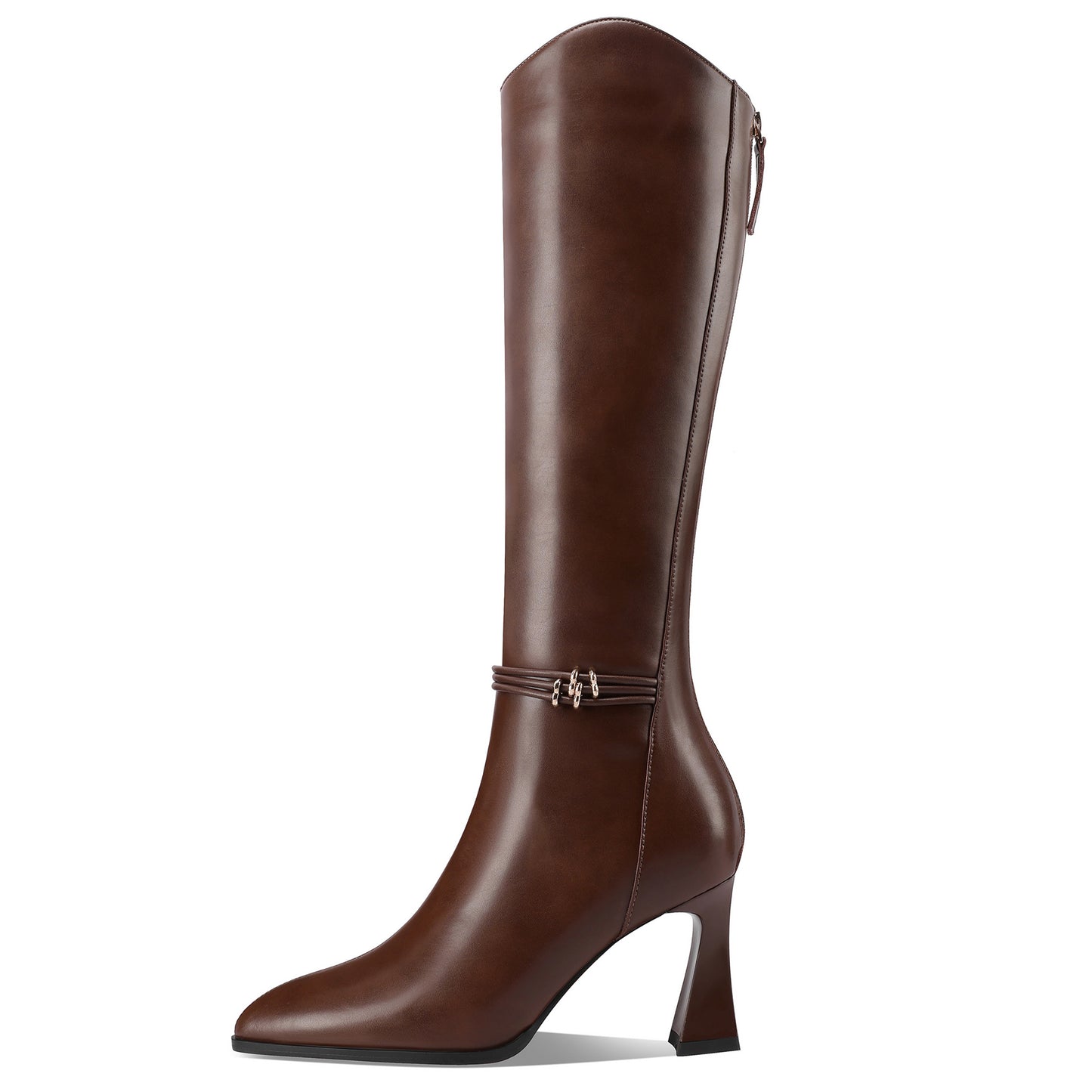 TinaCus Handgefertigte Damenstiefel aus echtem Leder mit spitzer Zehenpartie, Reißverschluss und Spulenabsatz, kniehoch