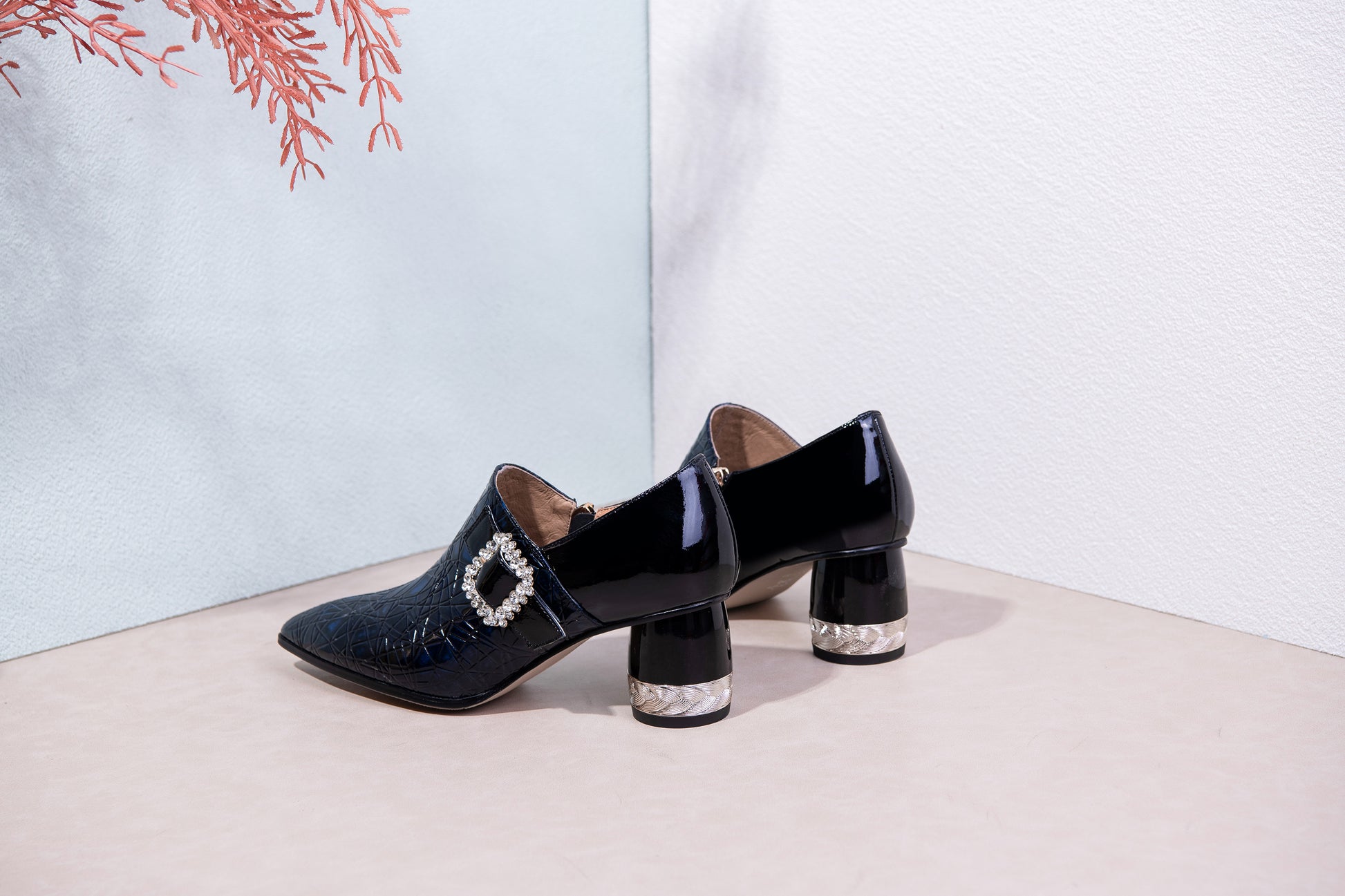 Klassische schwarze Pumps mit spitzer Spitze, Lackleder, Schnalle, Reißverschluss und Trichterabsatz passen zu fast allen Ihren Outfits.