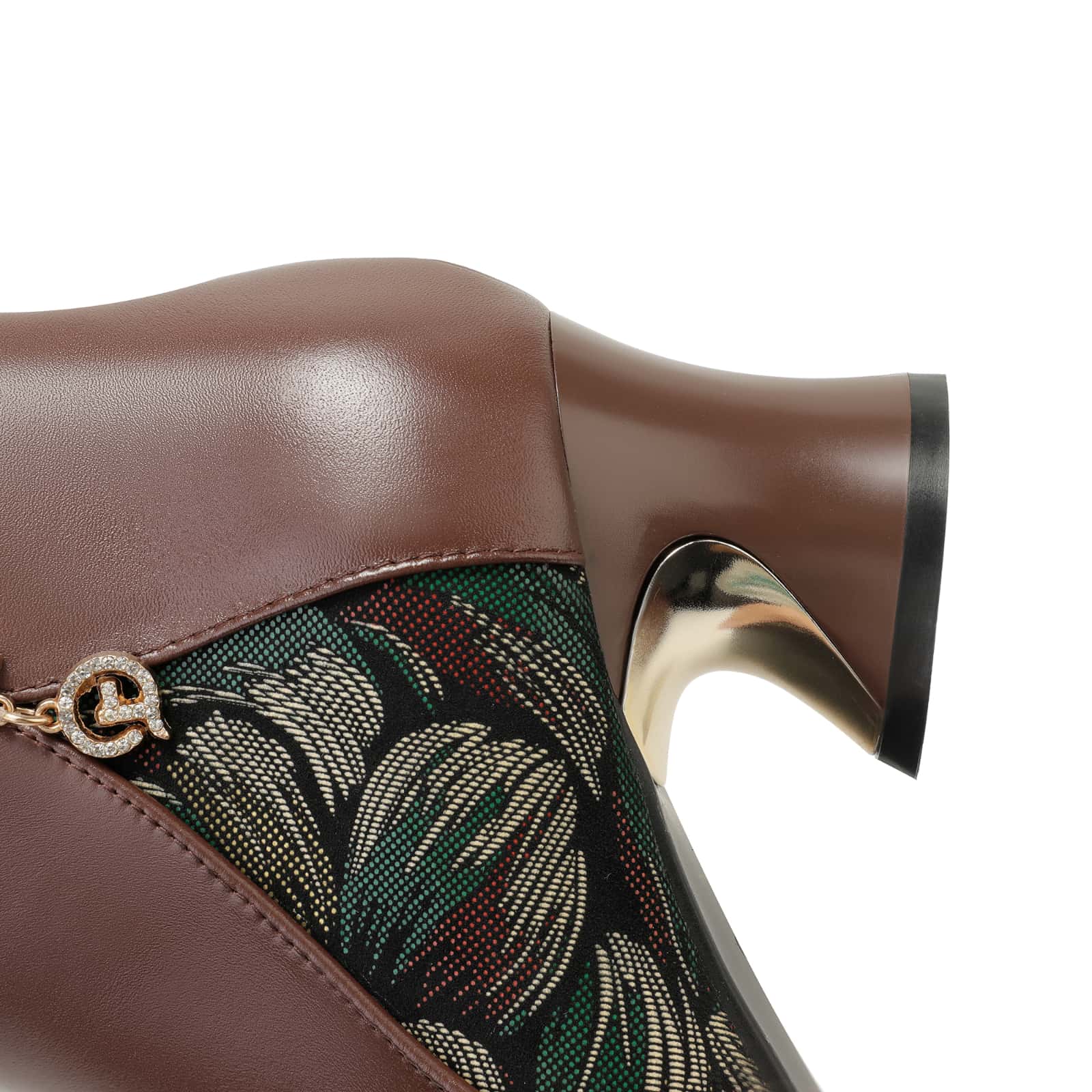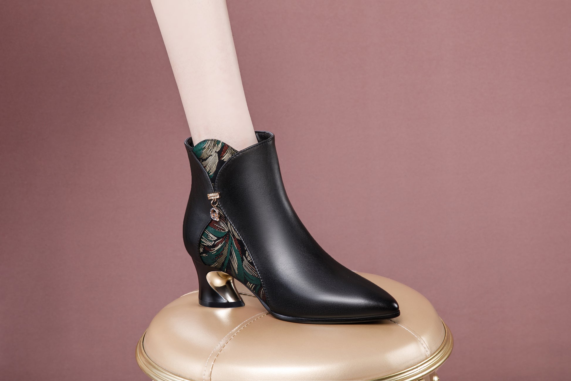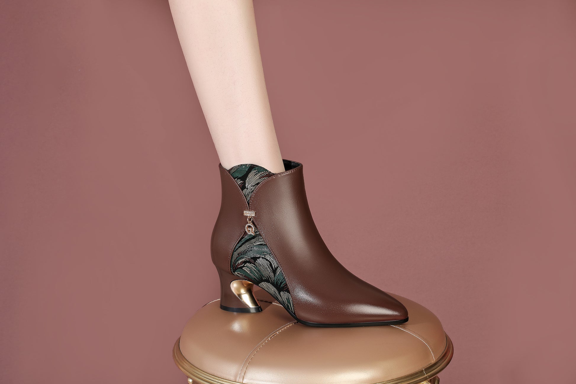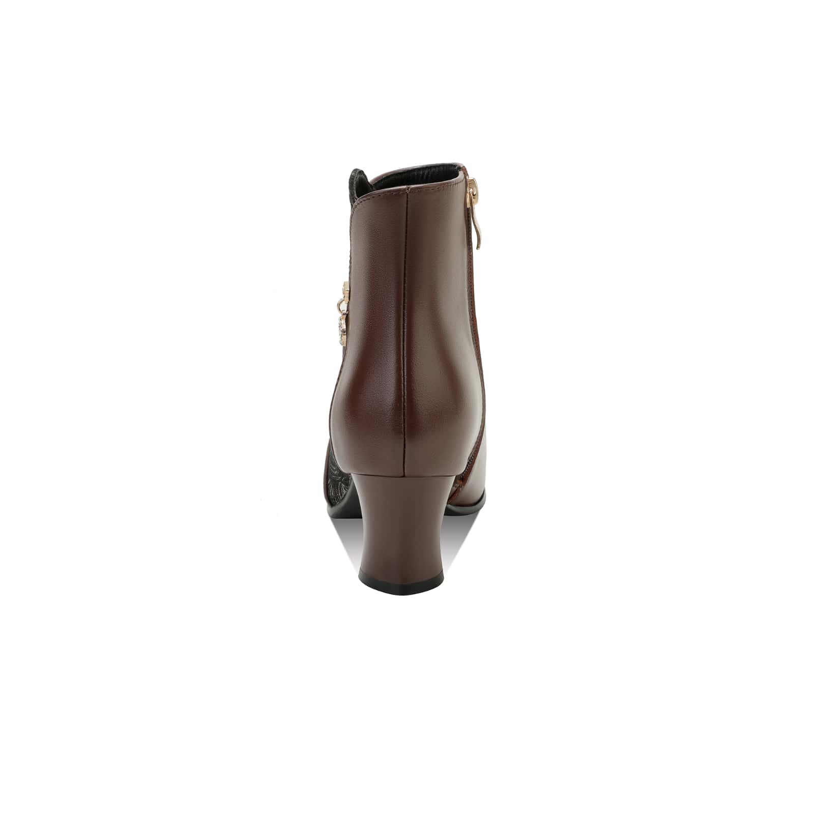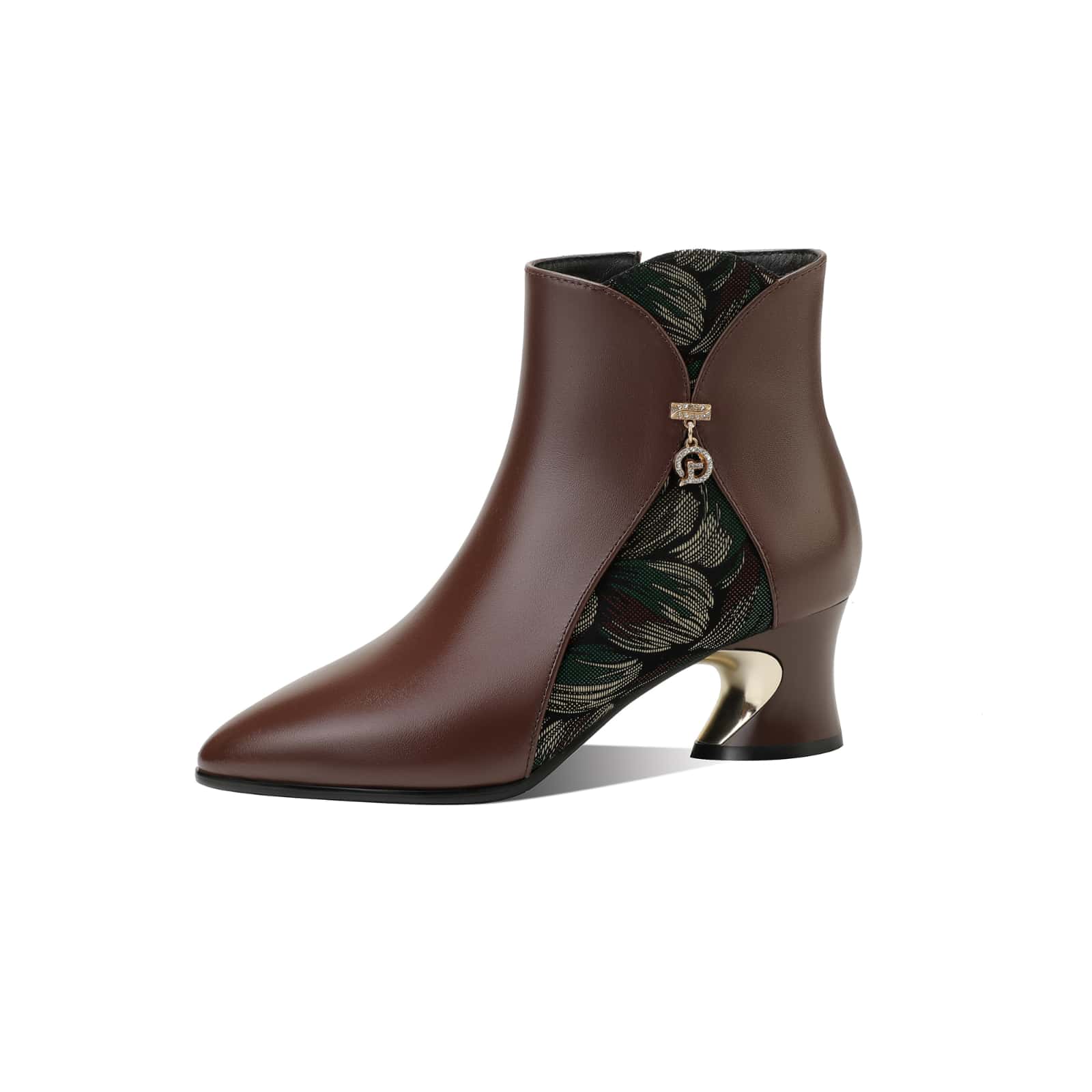 TinaCus Women's Genuine Leather Ankle Booties Handmade Pendant Printed Side Zipper Pointed Toe Chunky Heel