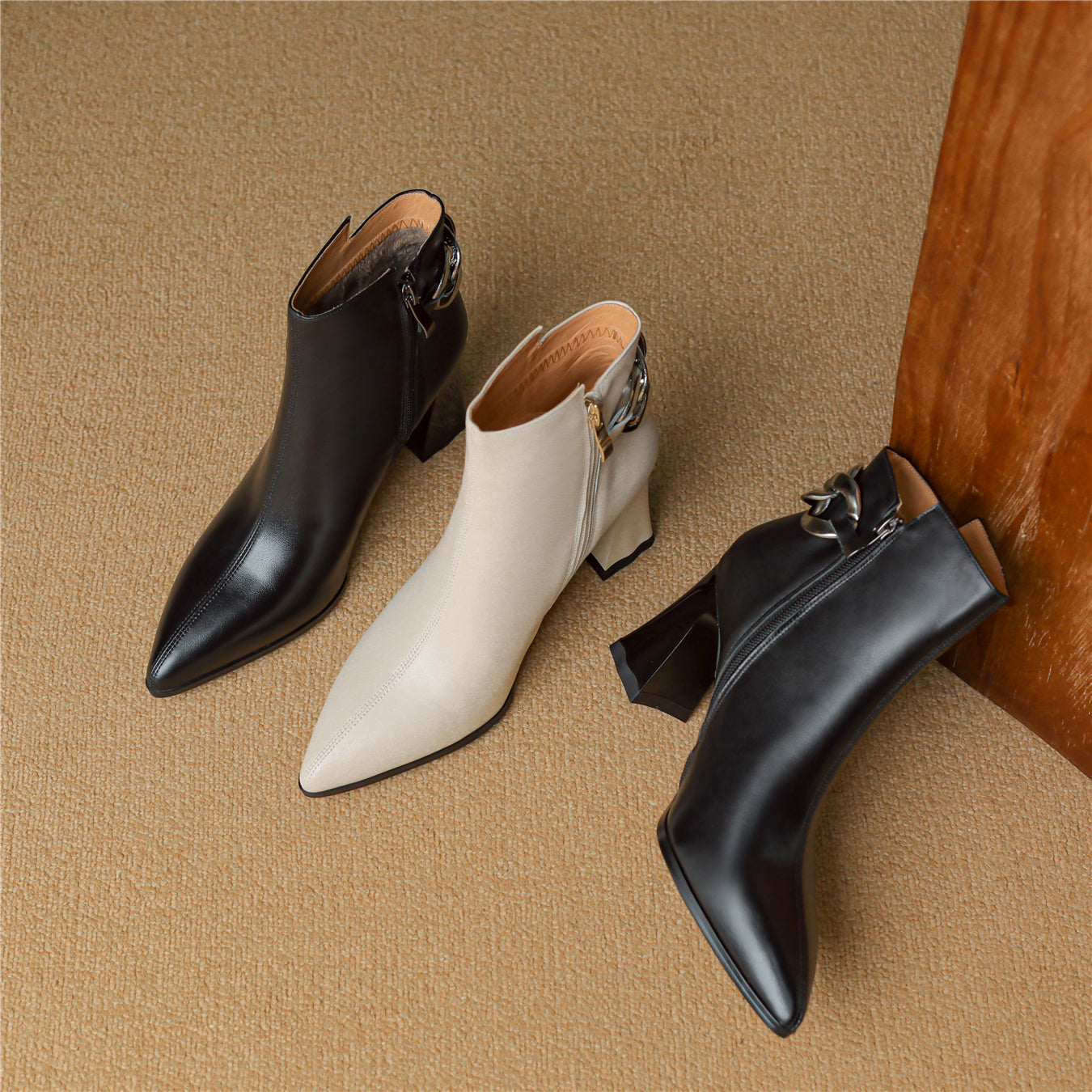 Stiefeletten sind mit spitzer Spitze, echtem Leder, Reißverschluss und klobigem Absatz gestaltet.