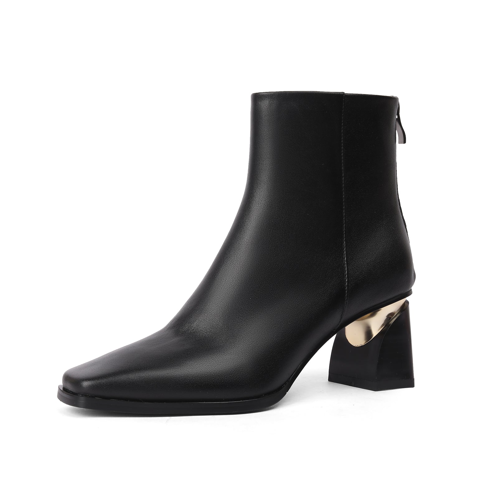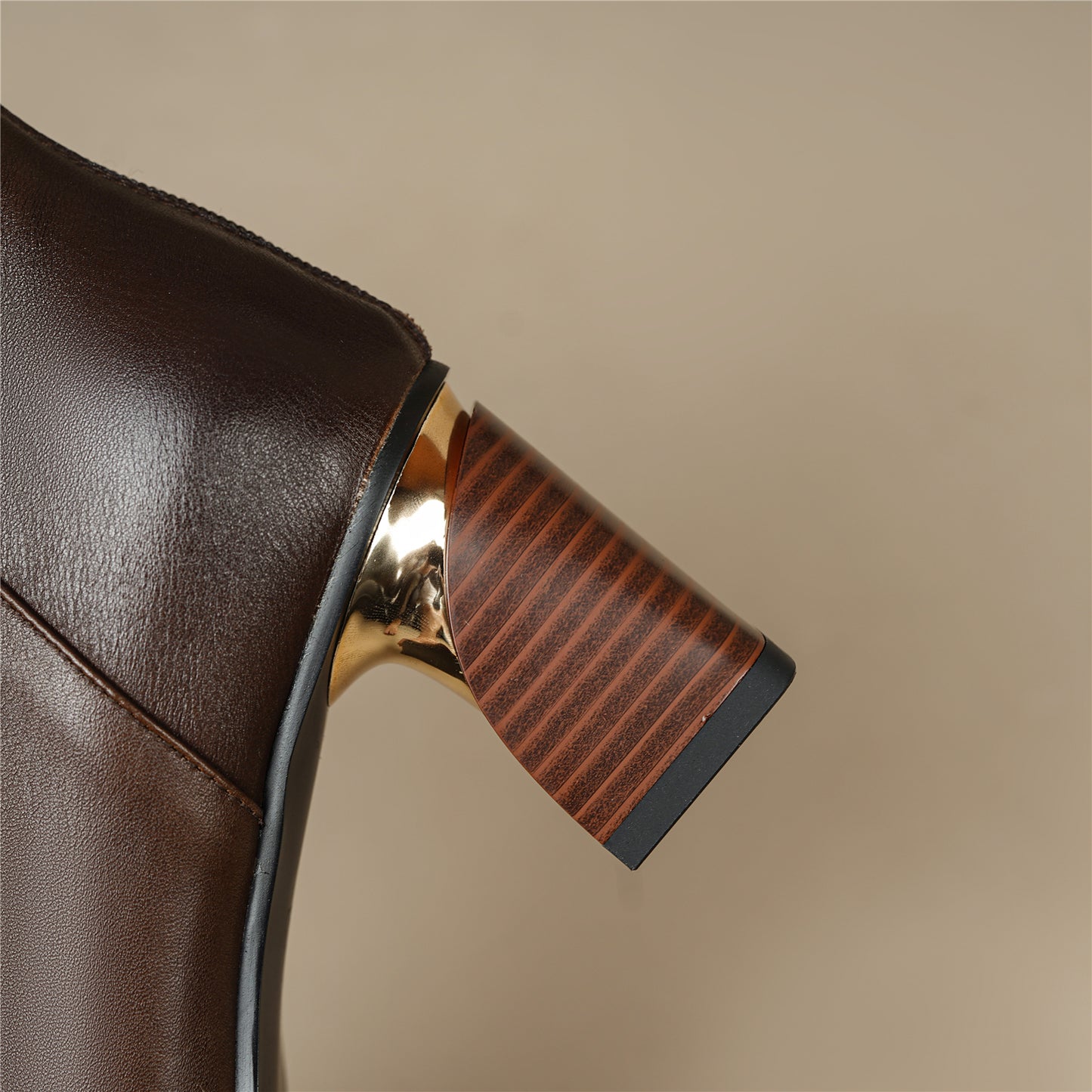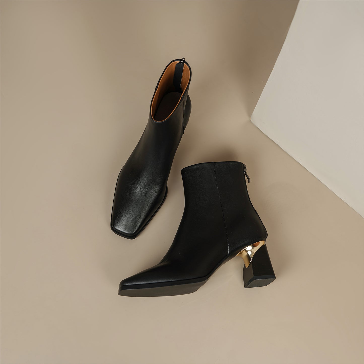 Stiefeletten sind mit spitzer Spitze, echtem Leder, Reißverschluss und klobigem Absatz gestaltet.