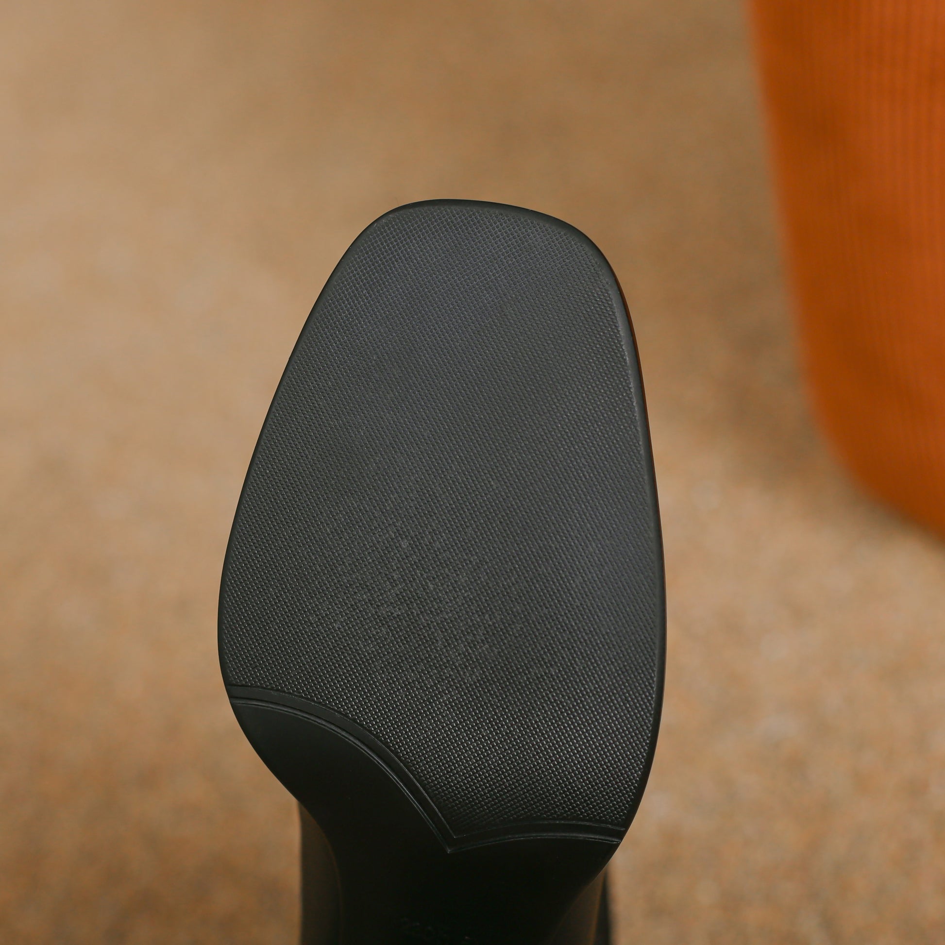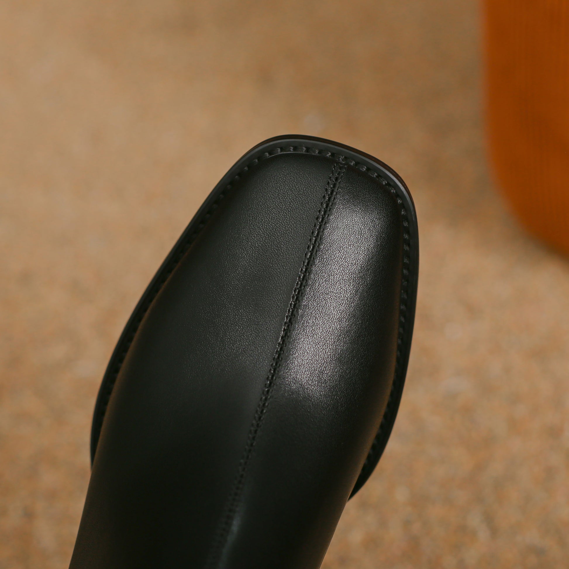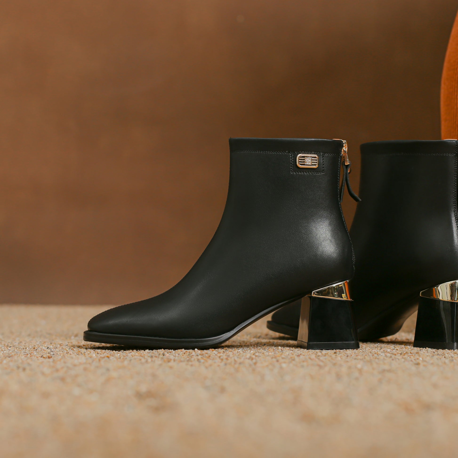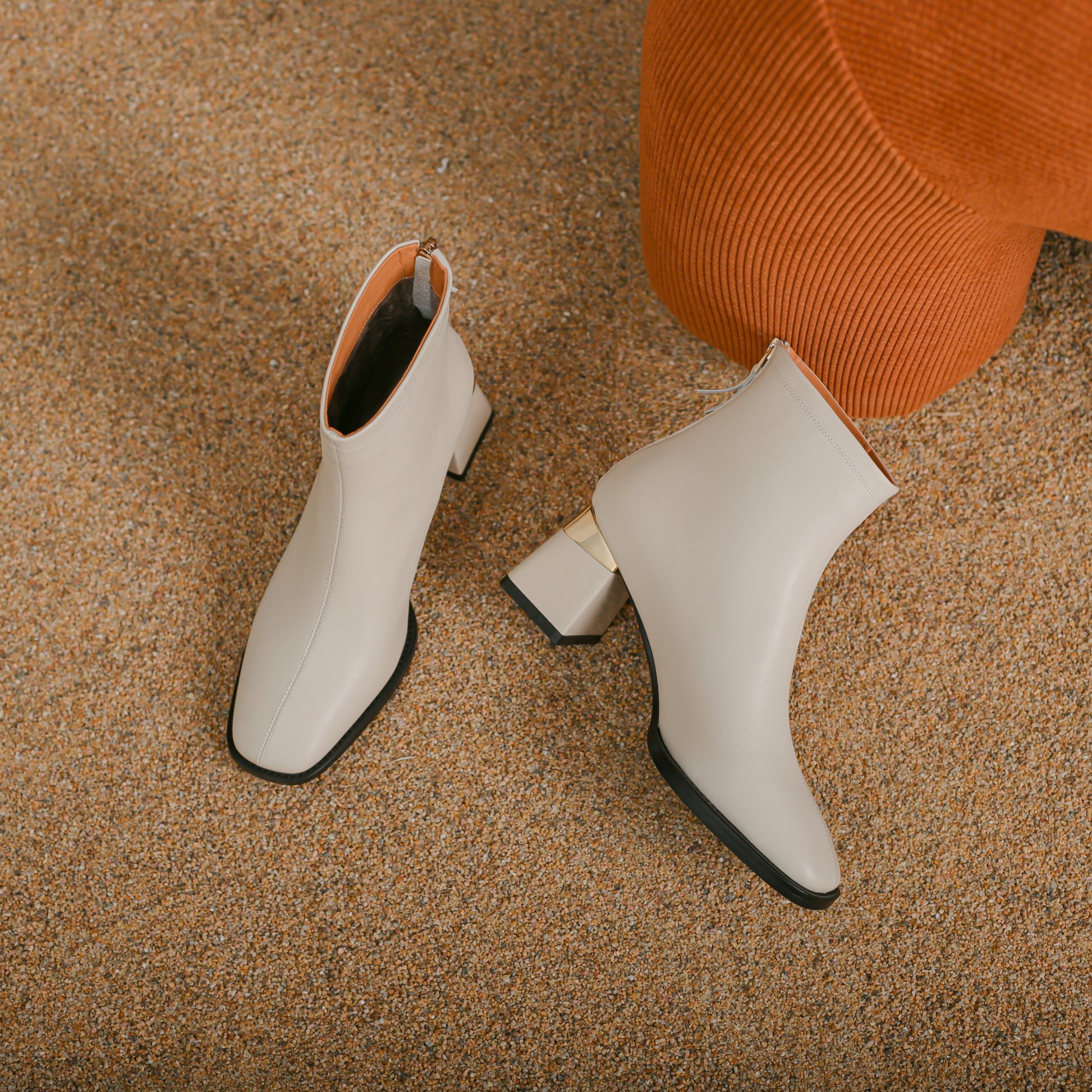 Stiefeletten sind mit quadratischer Spitze, echtem Leder, Reißverschluss und klobigem Absatz gestaltet.