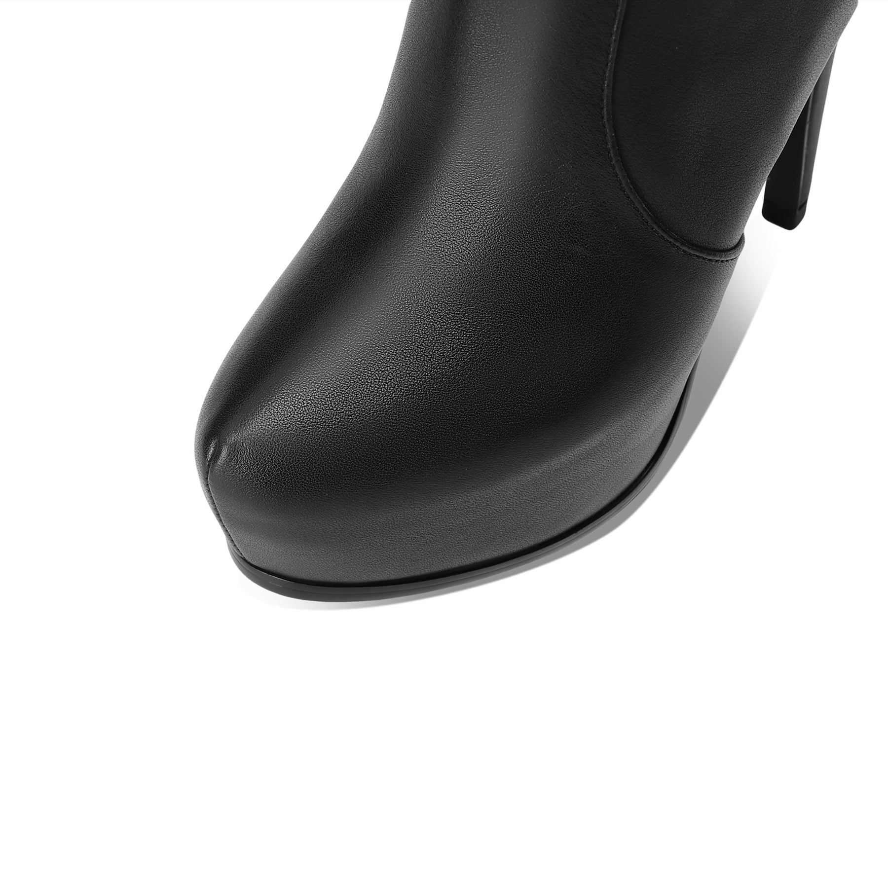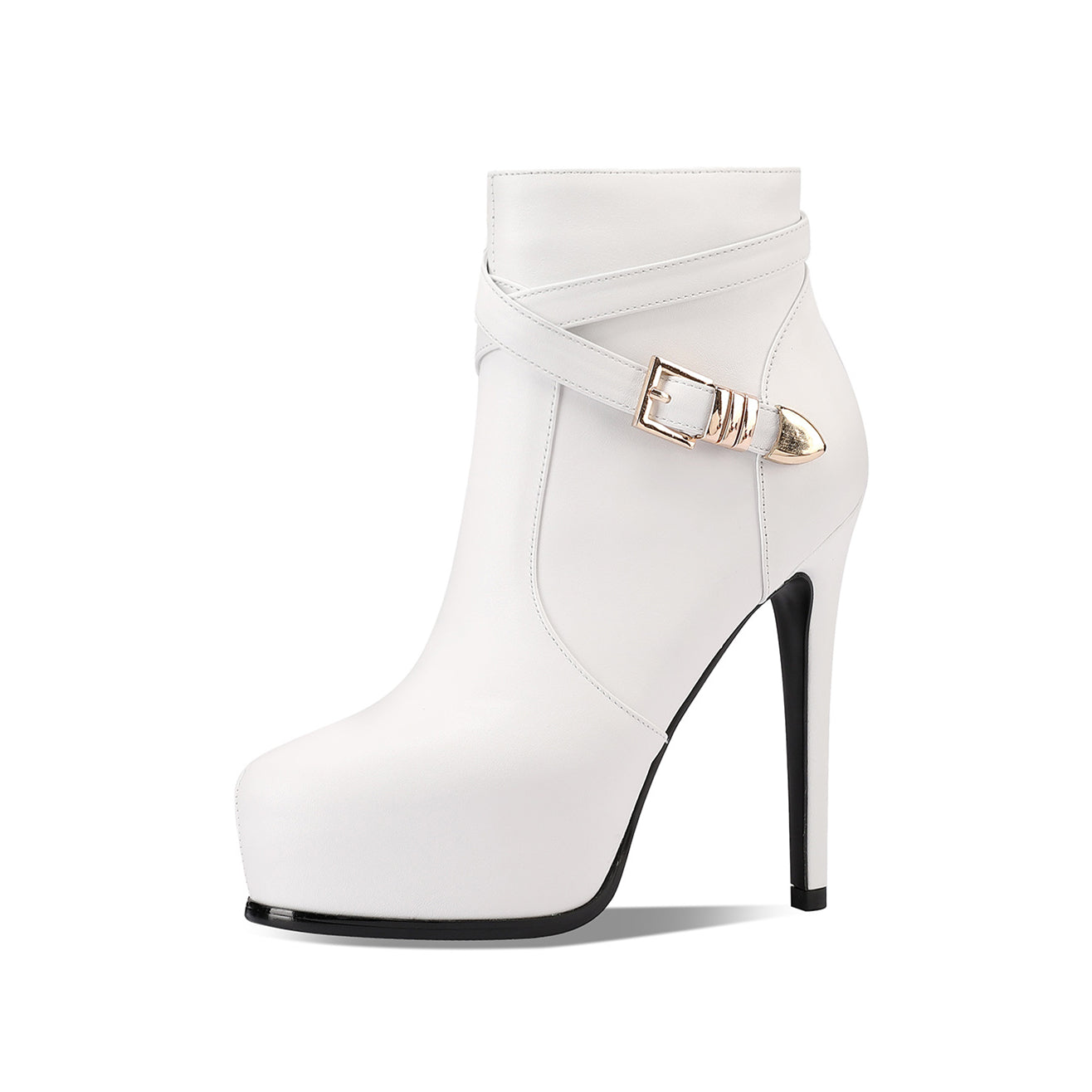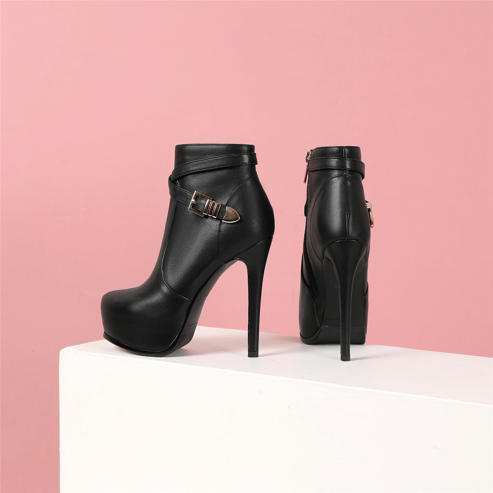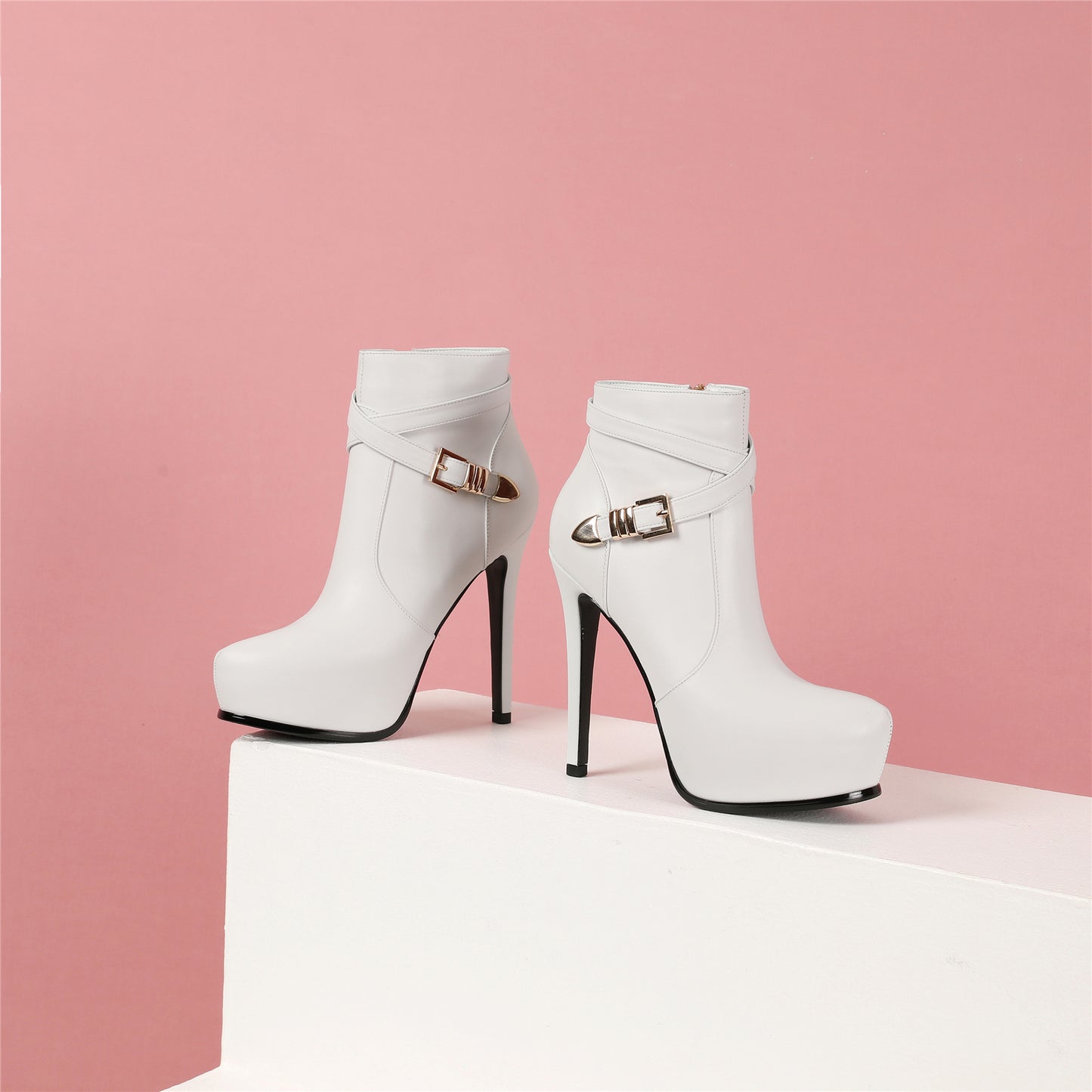 TinaCus Damen-Stiefeletten aus echtem Leder, handgefertigt, seitlicher Reißverschluss, Schnalle, hoher Stilettoabsatz, Plateau