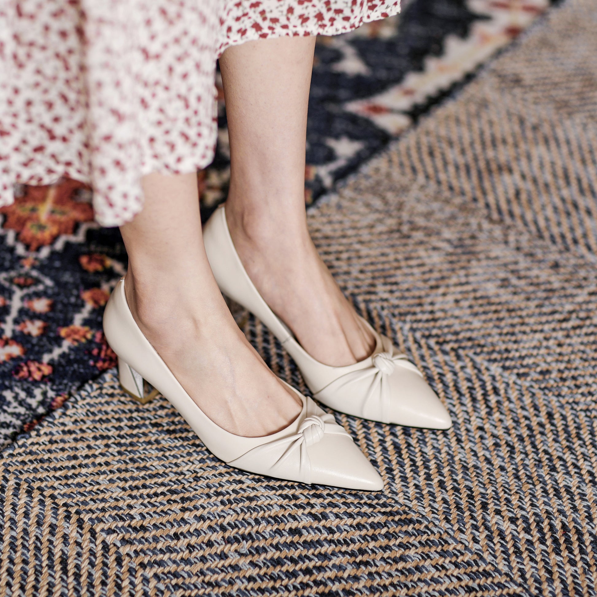 Stilvolle Pumps aus echtem Leder mit spitzer Spitze, Knotendekor und mittelhohem Blockabsatz passen zu fast allen Ihren Outfits.