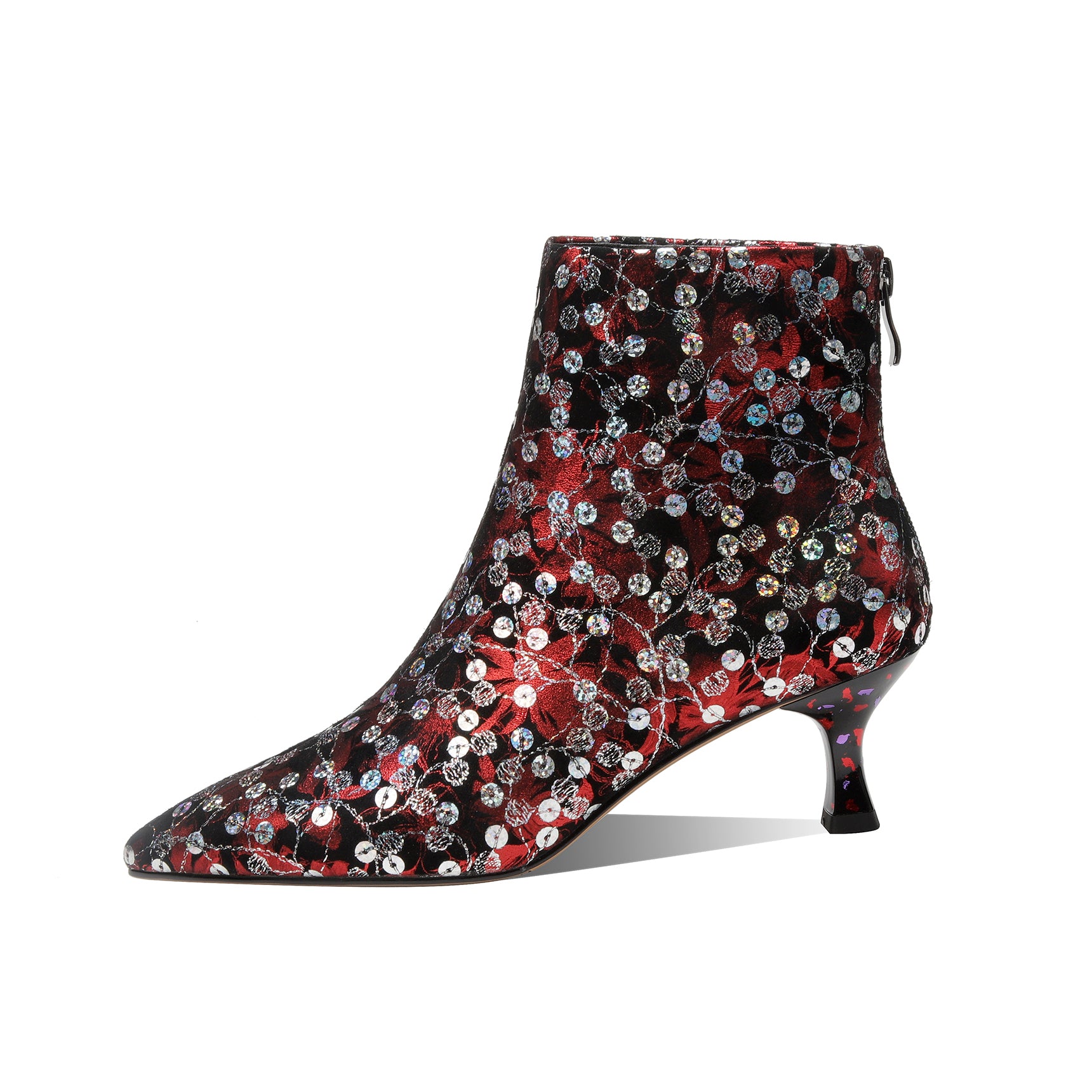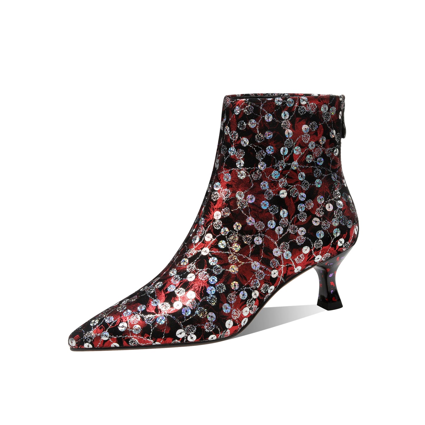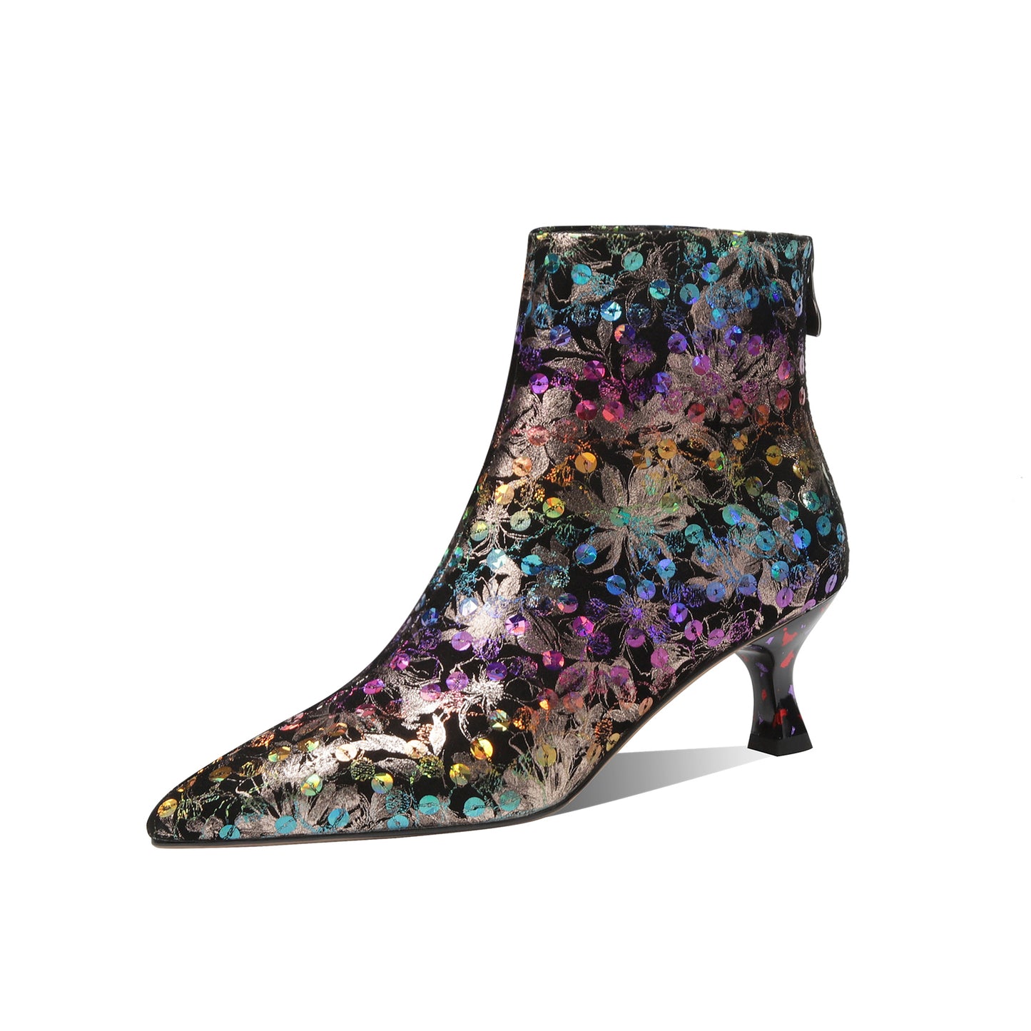 TinaCus Damen-Stiefeletten aus echtem Leder, handgefertigt, mit buntem Blumendruck, Pailletten und Reißverschluss