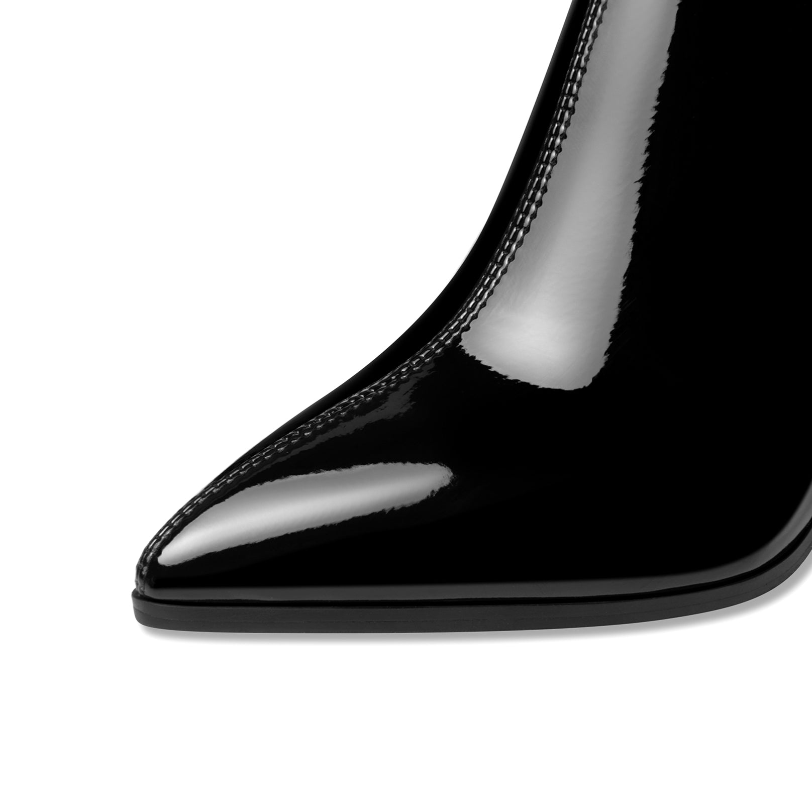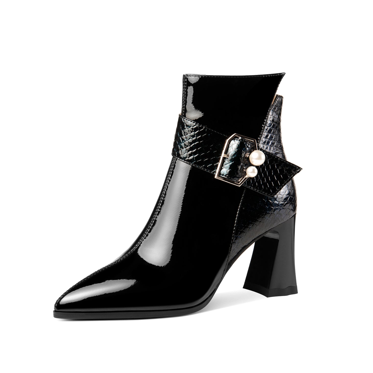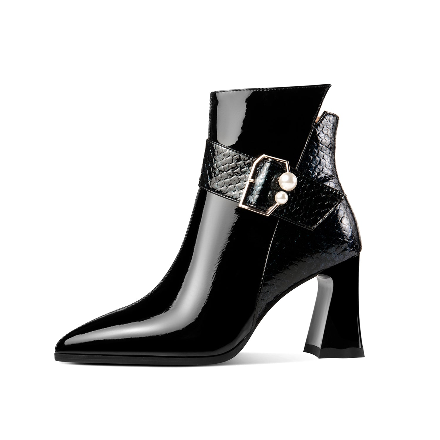 TinaCus Damen-Stiefeletten aus Lackleder, handgefertigt, mit hohem Absatz, Reißverschluss und Perlenschnalle
