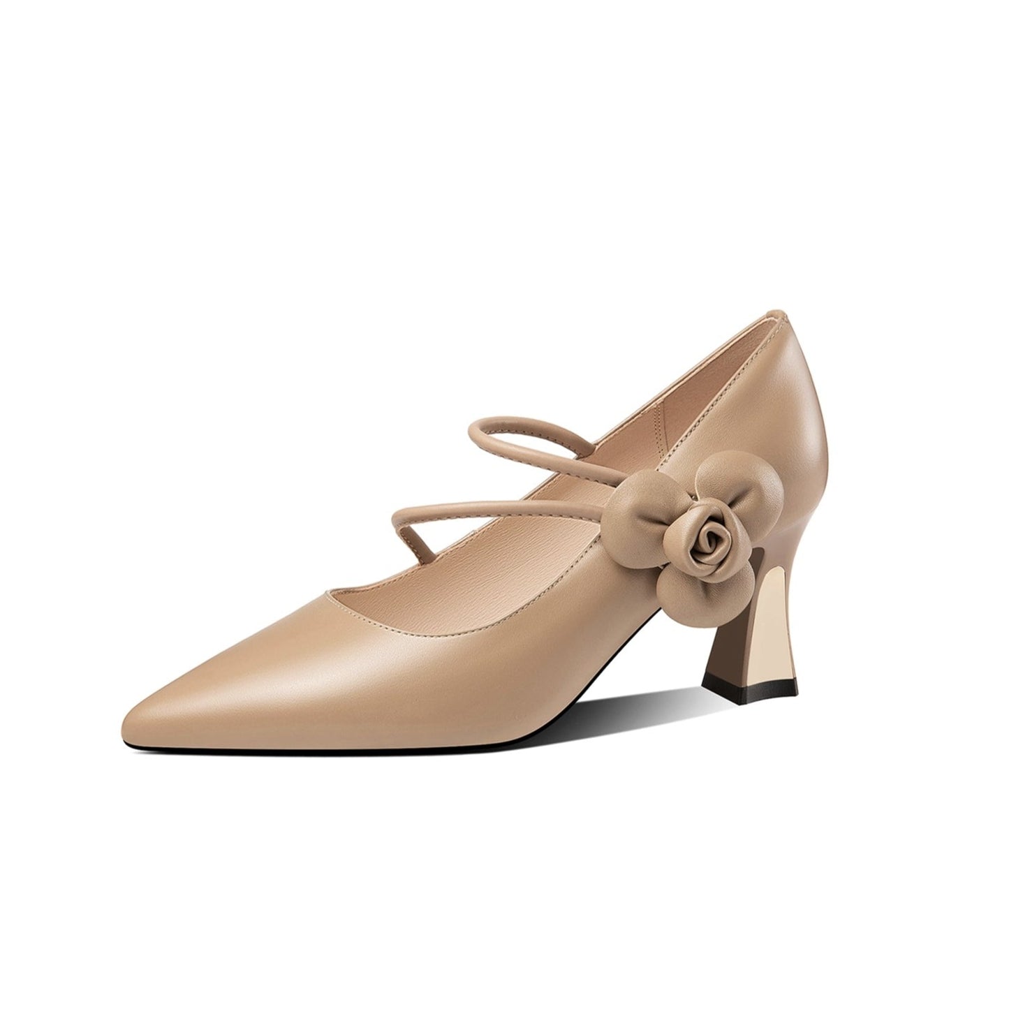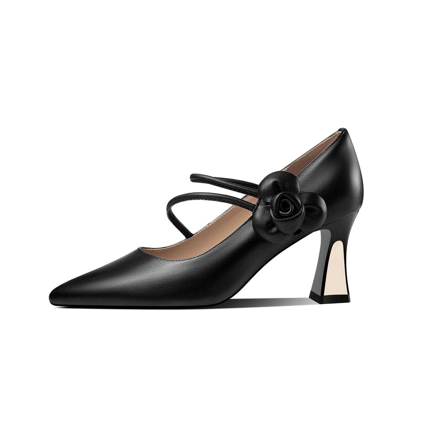 Elegante Pumps aus echtem Leder mit spitzer Spitze, Blumenmuster und klobigen Absätzen, um mit dem Modetrend Schritt zu halten.