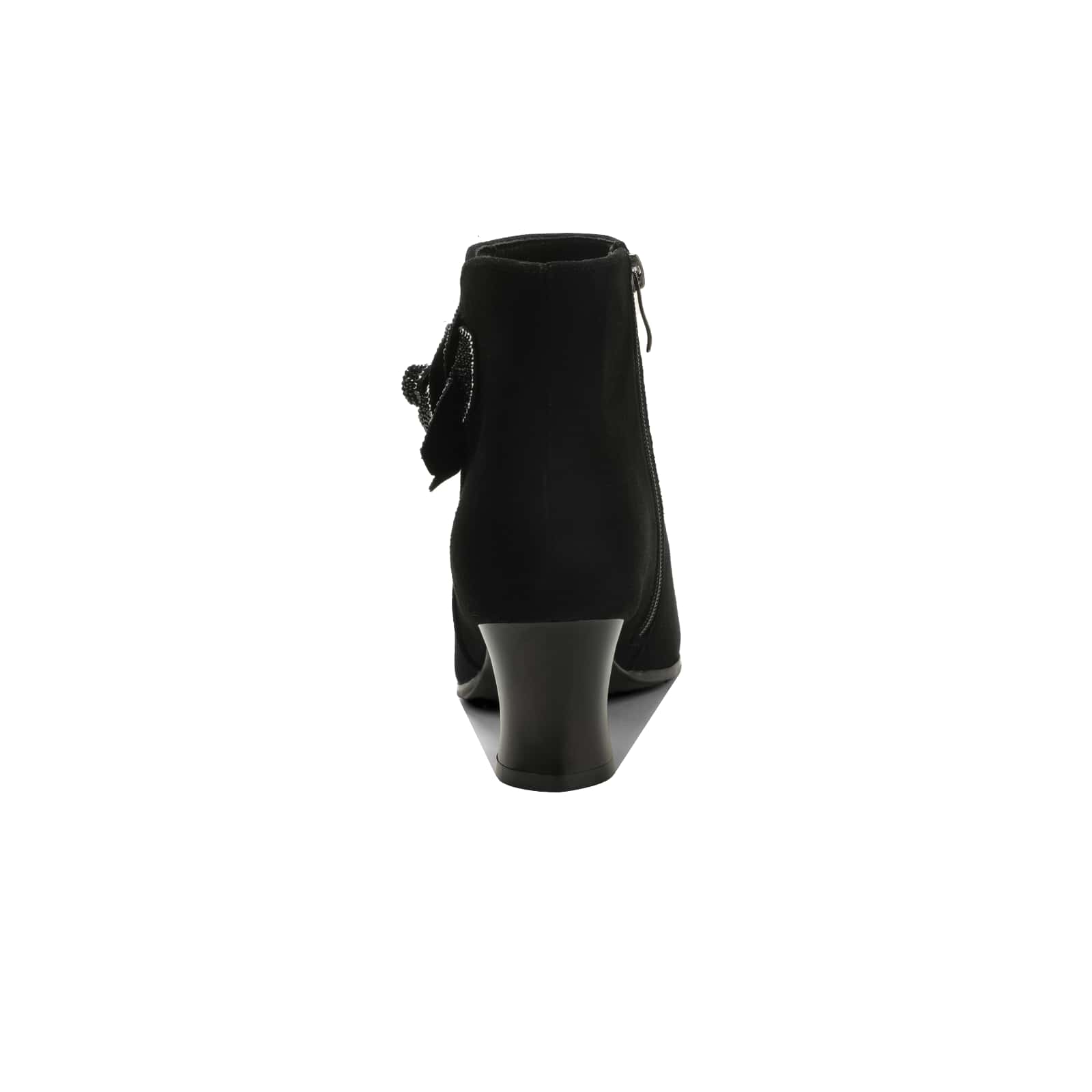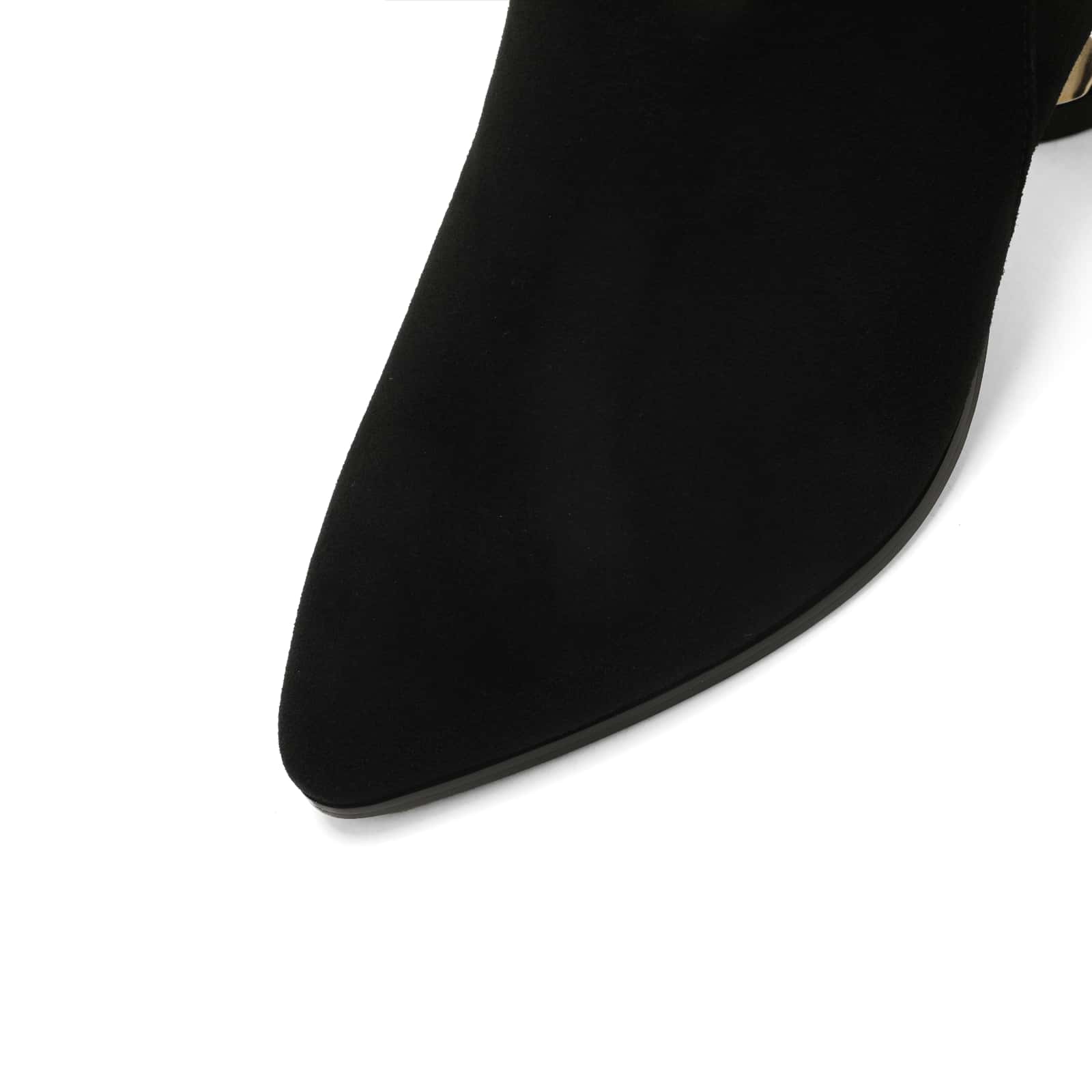 Suede leather, pointed toe, low chunky heel and rhinestone flower for a fashion look.