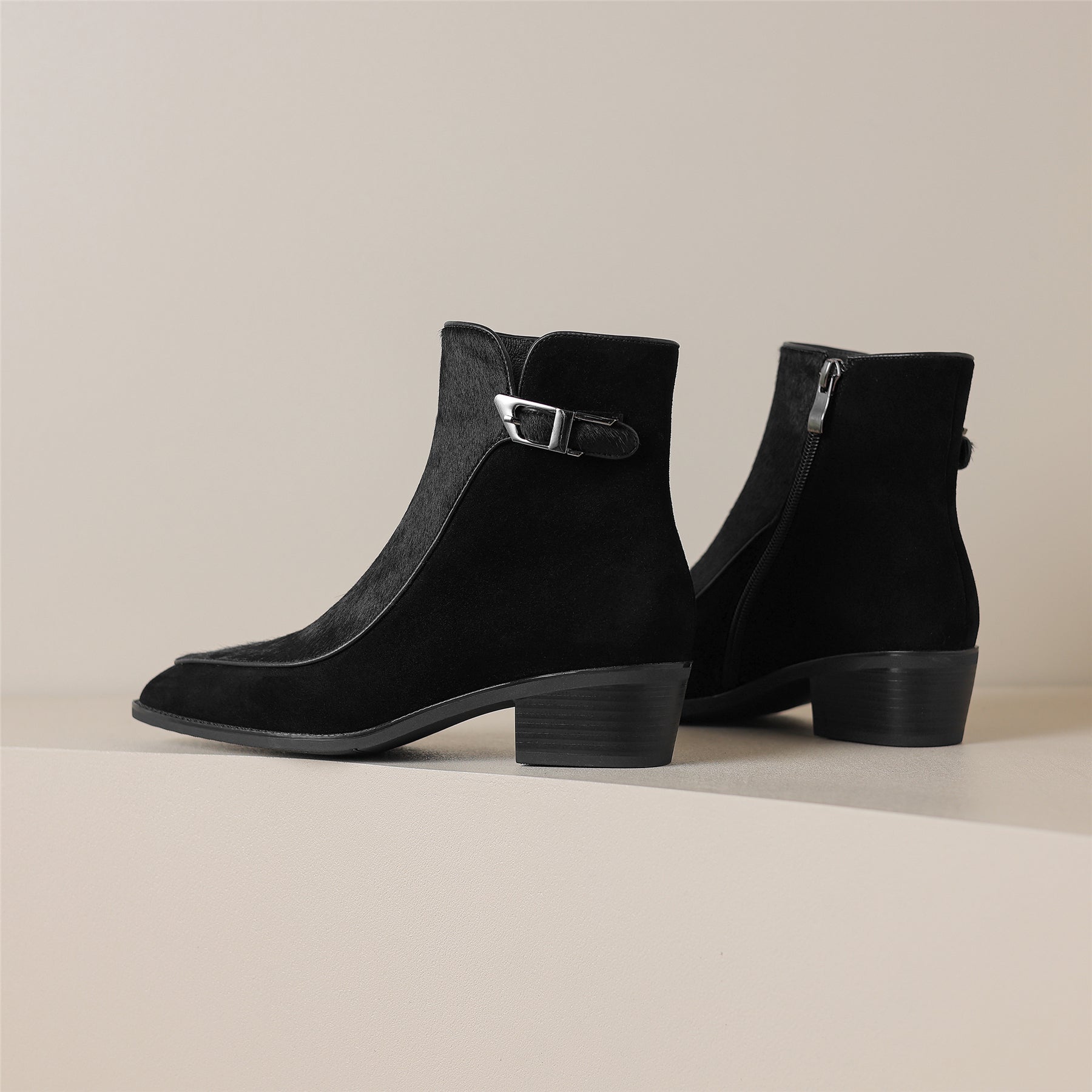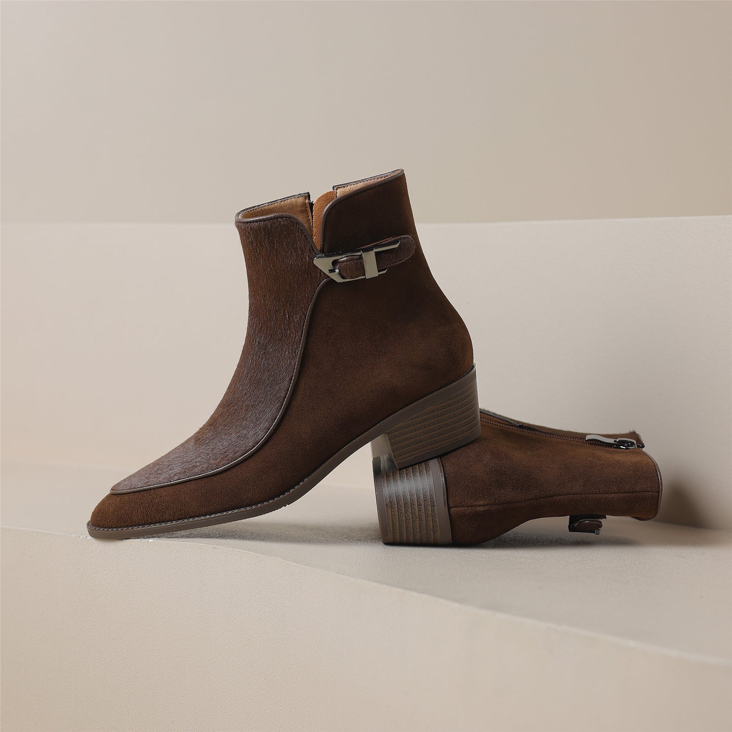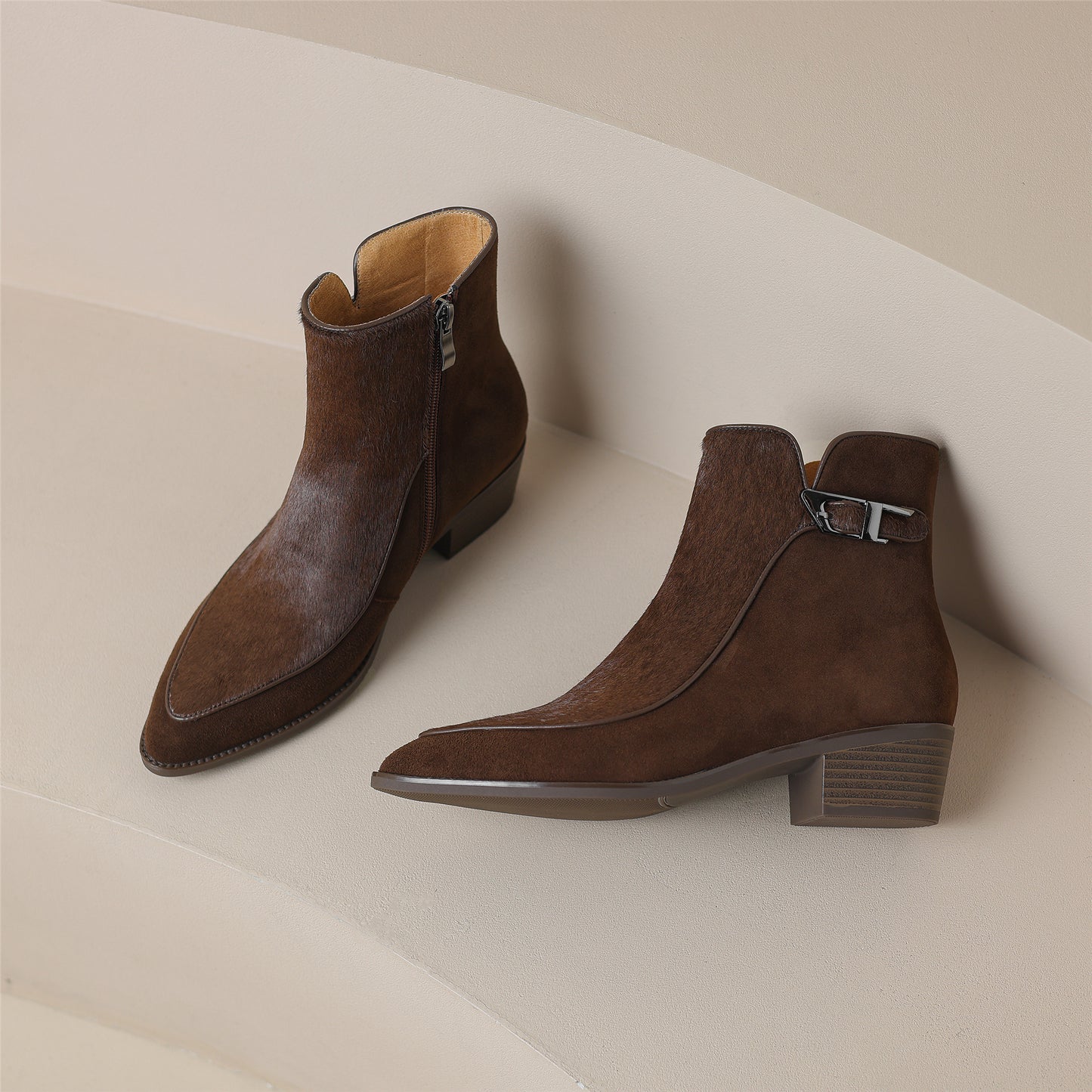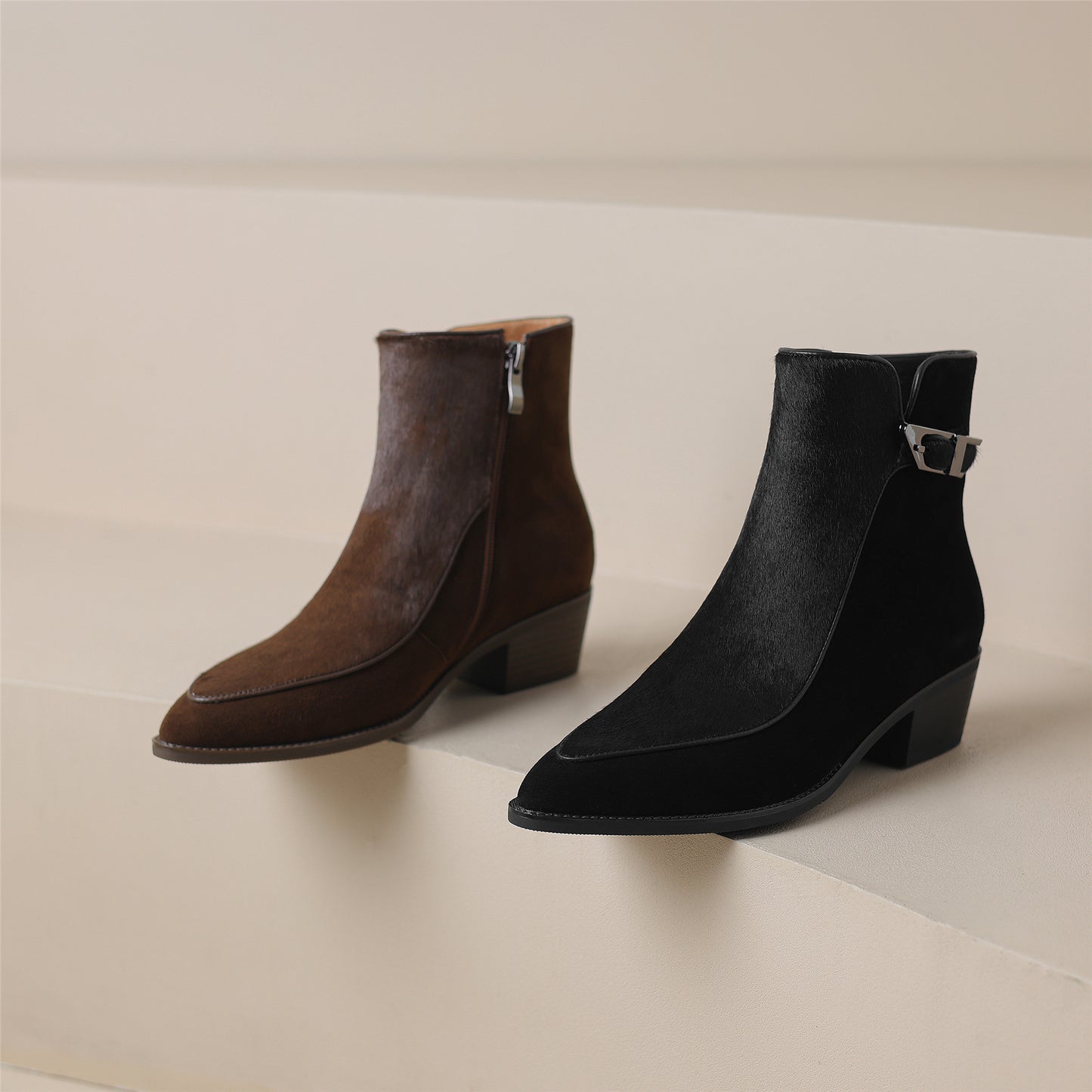 Stiefeletten werden aus Leder mit spitzer Spitze, Schnalle und Reißverschluss gefertigt, um mit dem Modetrend Schritt zu halten.
