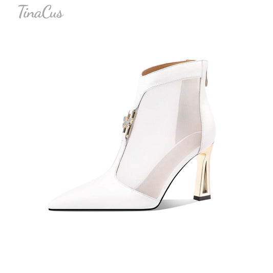 TinaCus Women's Handmade Patent Leather Mesh Hollow Chunky Heel Band Zip Up Summer Ankle Boots