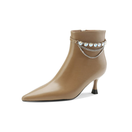 TinaCus Women's Genuine Leather Handmade Side Zip Up Crystal Chain Decor Pointed Toe Kitten Heel Ankle Boots