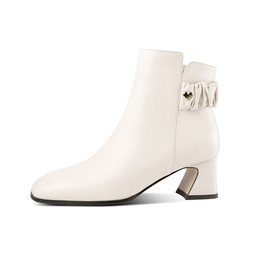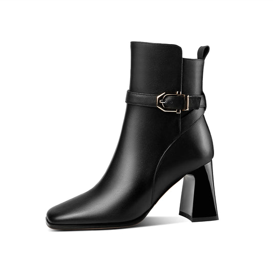 TinaCus Women's Square Toe Genuine Leather Handmade Matal Buckle High Chunky Heel Side Zip Up Chic Ankle Boots