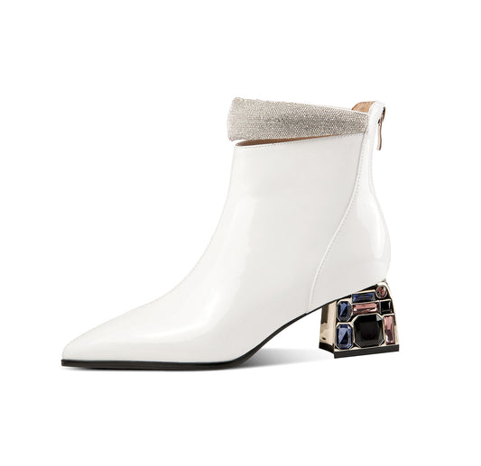 TinaCus Patent Leather Women's Handmade Pointed Toe Crystal Chunky Heel Back Zip Up Ankle Booties