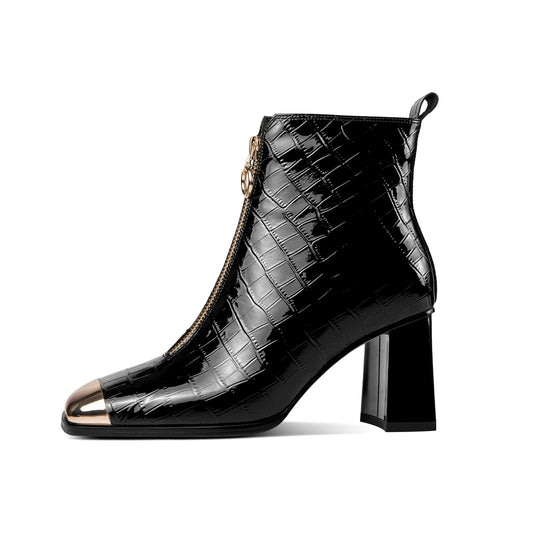 TinaCus Women's Checkered Patent Leather Handmade Chunky Heel Front Zipper Square Toe Ankle Boots