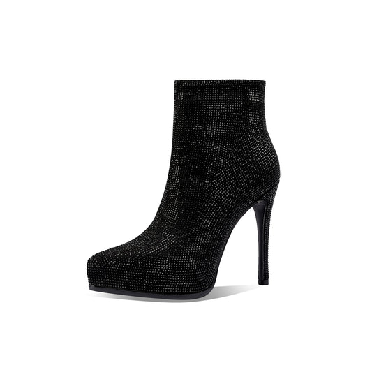 TinaCus Handmade Women's Genuine Leather Glittering Rhinestones Platform Side Zipper Pointed Toe High Stiletto Heel Ankle Boots