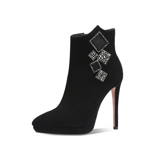 TinaCus Handmade Women's Suede Leather Cube Rhinestones Side Zipper Pointed Toe Platform High Stiletto Heel Ankle Boots