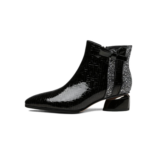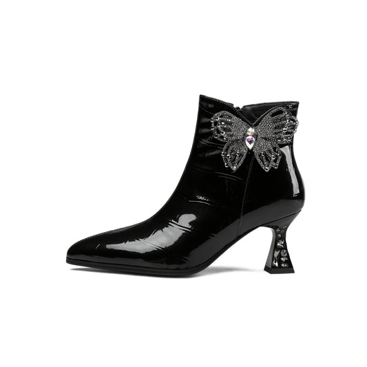 TinaCus Women's Pointed Toe Glossy Patent Leather Handmade Butterfly Side Zipper Mid Heels Stylish Ankle Boots