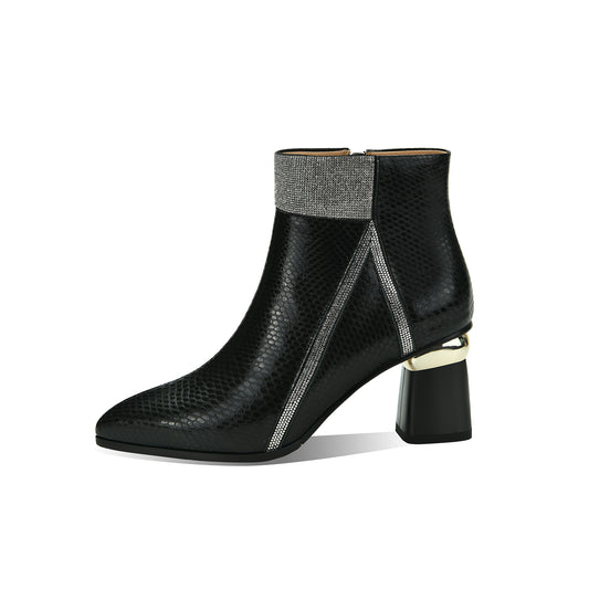 TinaCus Women's Genuine Leather Handmade Stylish Chunky Heel Side Zip Up Glitter Rhinestone Decor Ankle Booties