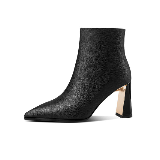 TinaCus Handmade Women's Genuine Leather Litchi Rind Pointed Toe Side Zipper High Block Heel Ankle Boots