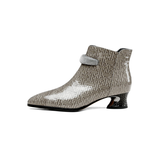TinaCus Handmade Women's Genuine Leather Printed Glossy Side Zipper Pointed Toe Mid Chunky Heel Ankle Boots