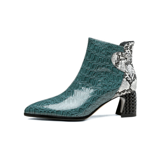 TinaCus Handmade Women's Patent Leather Patchwork Color Snakeskin Pointed Toe Side Zipper Mid Block Heel Ankle Boots Shoes