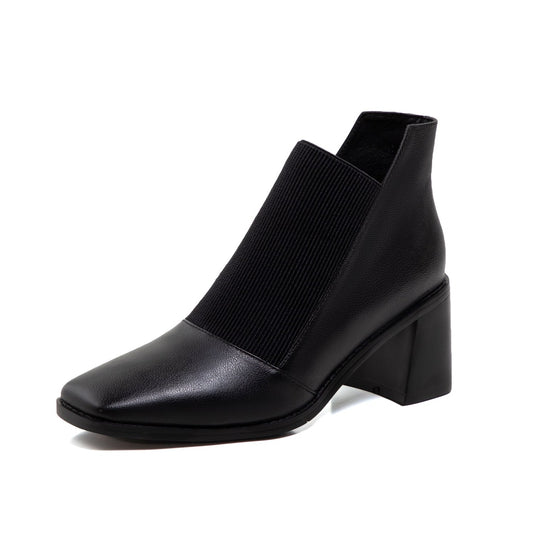 TinaCus Women's Genuine Leather with Elastic Handmade Square Toe Mid Chunky Heels Casual Ankle Boots