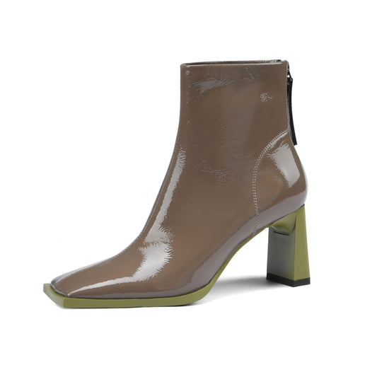 TinaCus Patent Leather Women's Handmade Back Zip Up Classic Square Toe Chunky Heel Glossy Ankle Booties