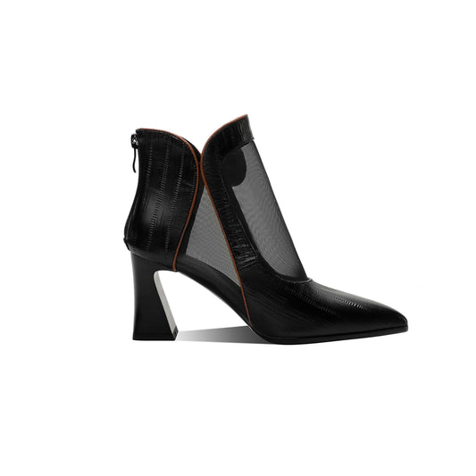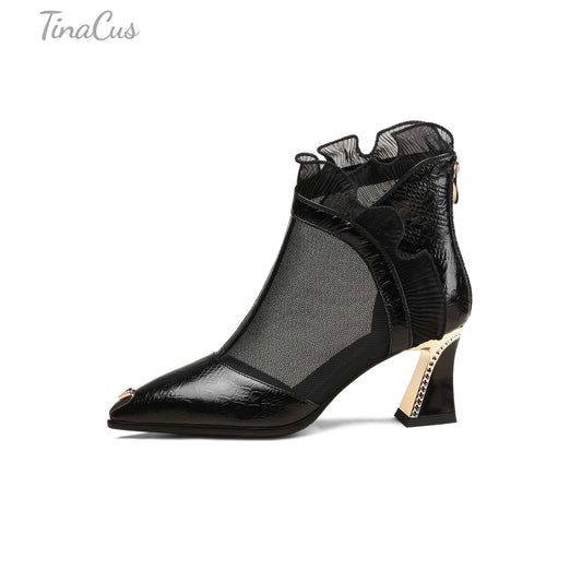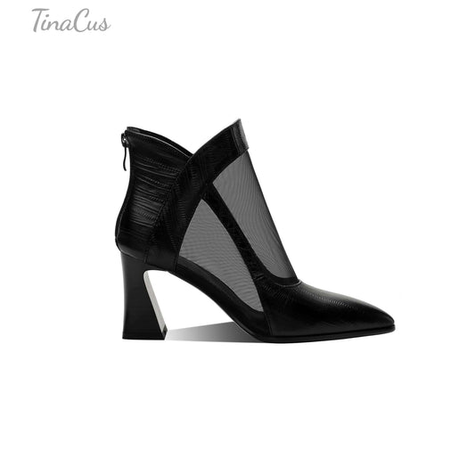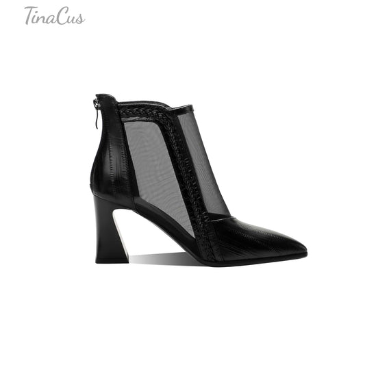 TinaCus Handmade Women's Leather&Mesh V-cutting Pointed Toe Back Zip Ankle Booties