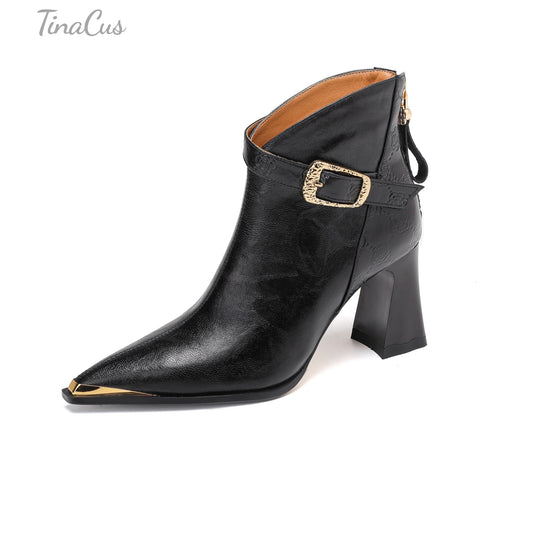 TinaCus Pointed Toe Embossed Genuine Leather High Chunky Heels Women's Zip up Ankle Boots with Buckle