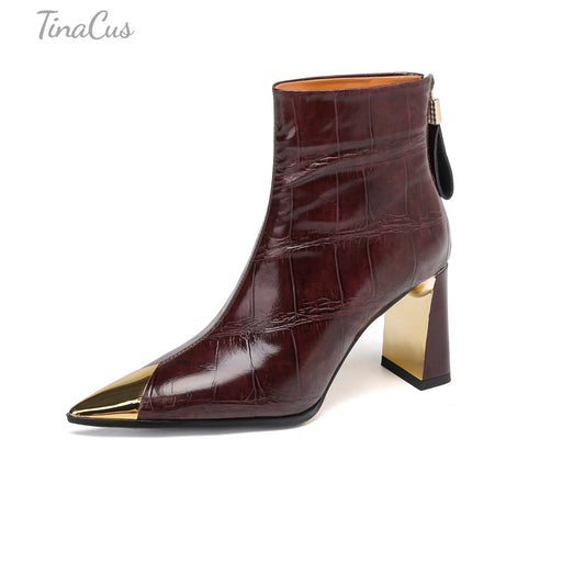 TinaCus Women's Cap Toe Embossed Genuine Leather Handmade High Heels Back Zip up Ankle Boots