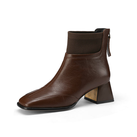 TinaCus Plaid Pattern Genuine Leather Women's Square Toe Handmade Mid Heels Ankle Boots with Back Zipper