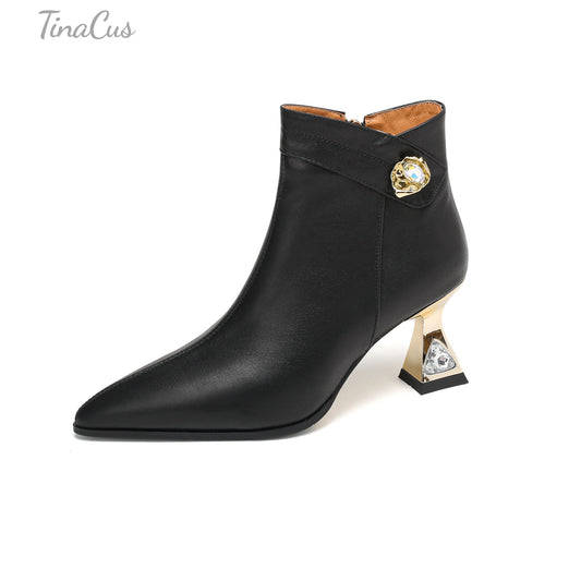 TinaCus Women's Pointed Toe Genuine Leather Handmade Chunky Heels Back Zip up Ankle Boots