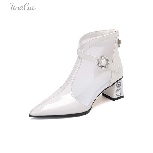 TinaCus Handmade Women's Leather&Mesh Pointed Toe Rhinestone Back Zipper Block Heel Ankle Booties