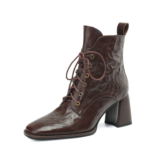 TinaCus Women's Genuine Leather Lace Up Side Zip Square Toe Handmade Chunky Heel Ankle Boots