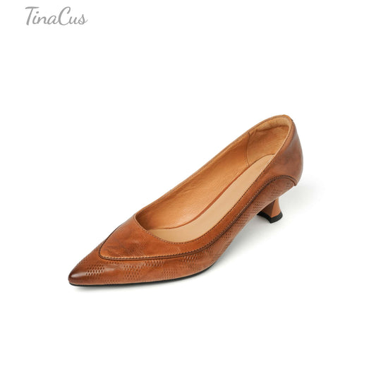 TinaCus Handmade Women's Genuine Leather Slip On Embossed Pointed Toe Kitten Heel Pumps