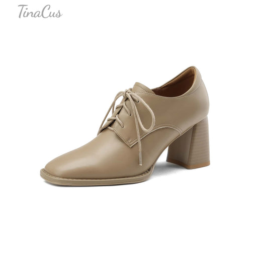 TinaCus Women's Genuine Leather Handmade Classic Square Toe Lace Up Low Stacked Heel Retro Oxford Pumps Shoes