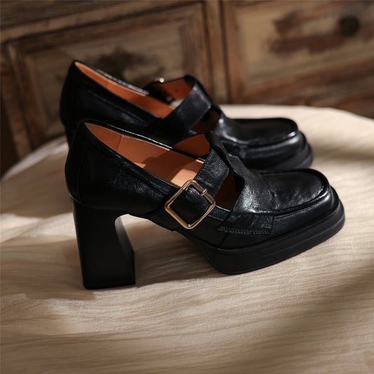 TinaCus Women's Handmade Genuine Leather Platform Buckle Chunky Heel Pumps