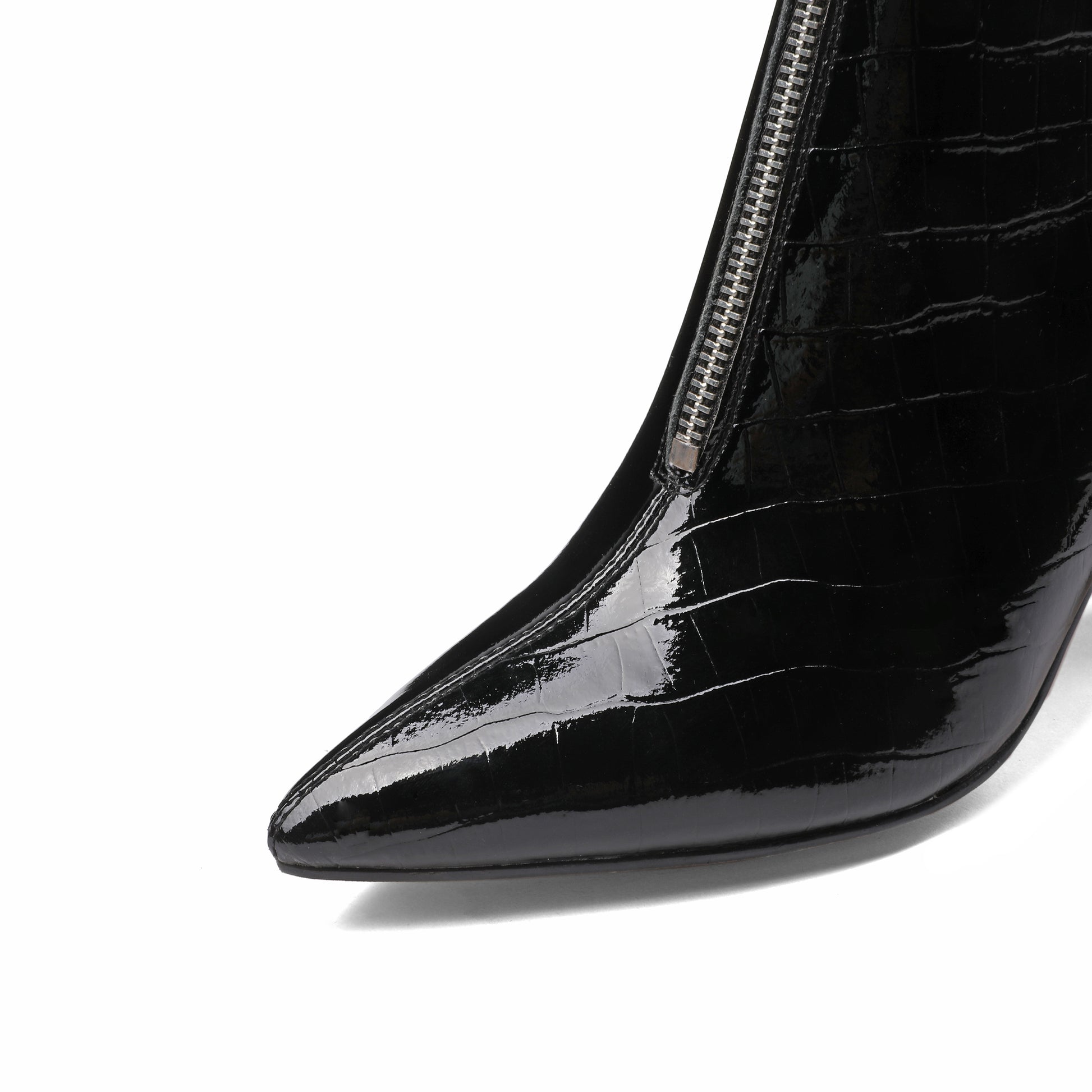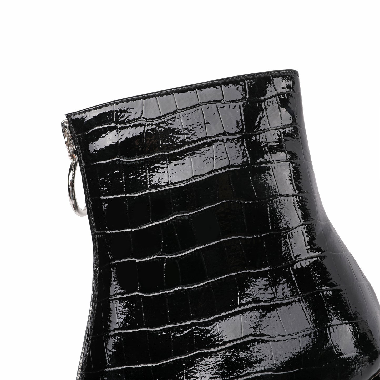 Graceful ankle boots designed with genuine leather, pointed toe, front zip, mid chunky heel to keep up with fashion trend.