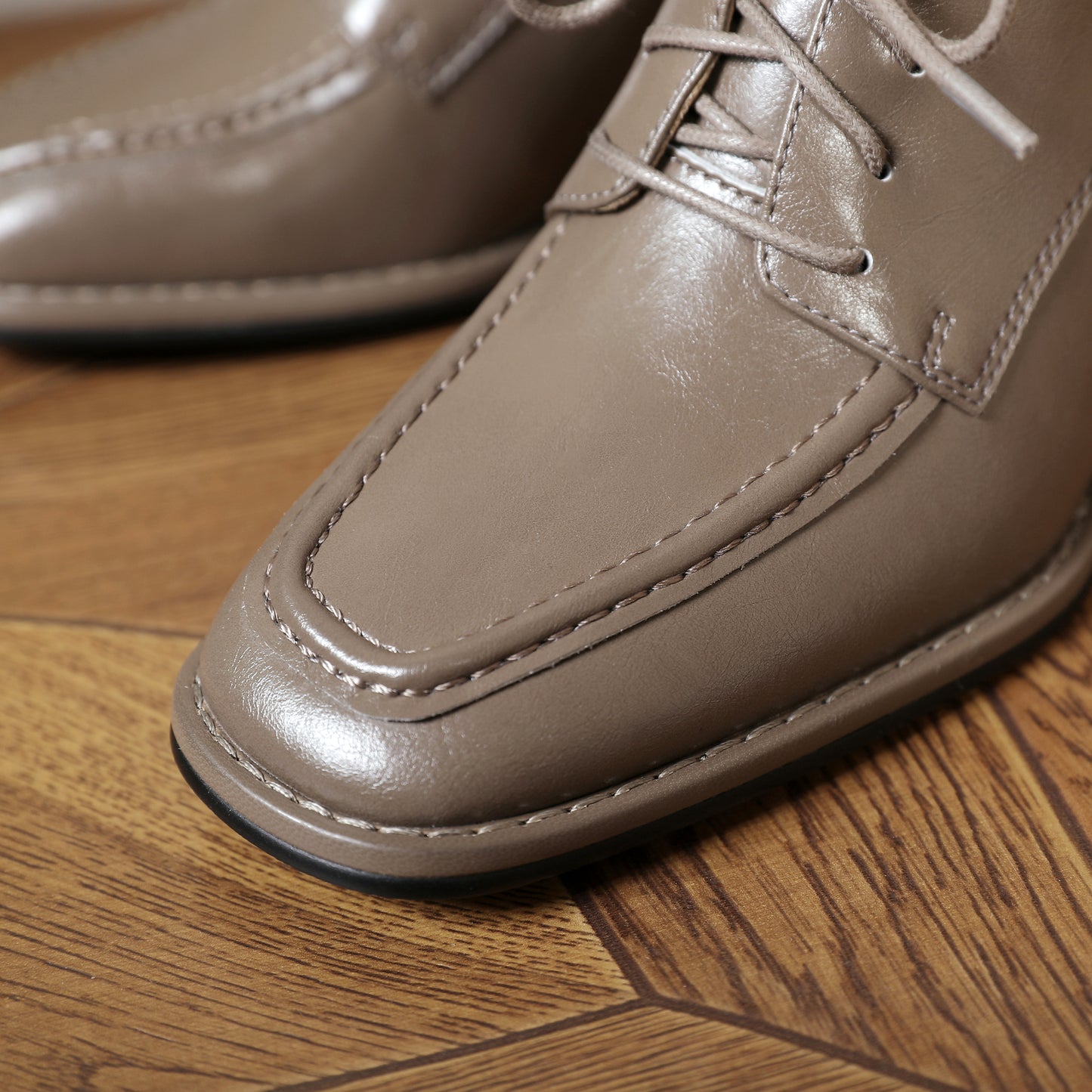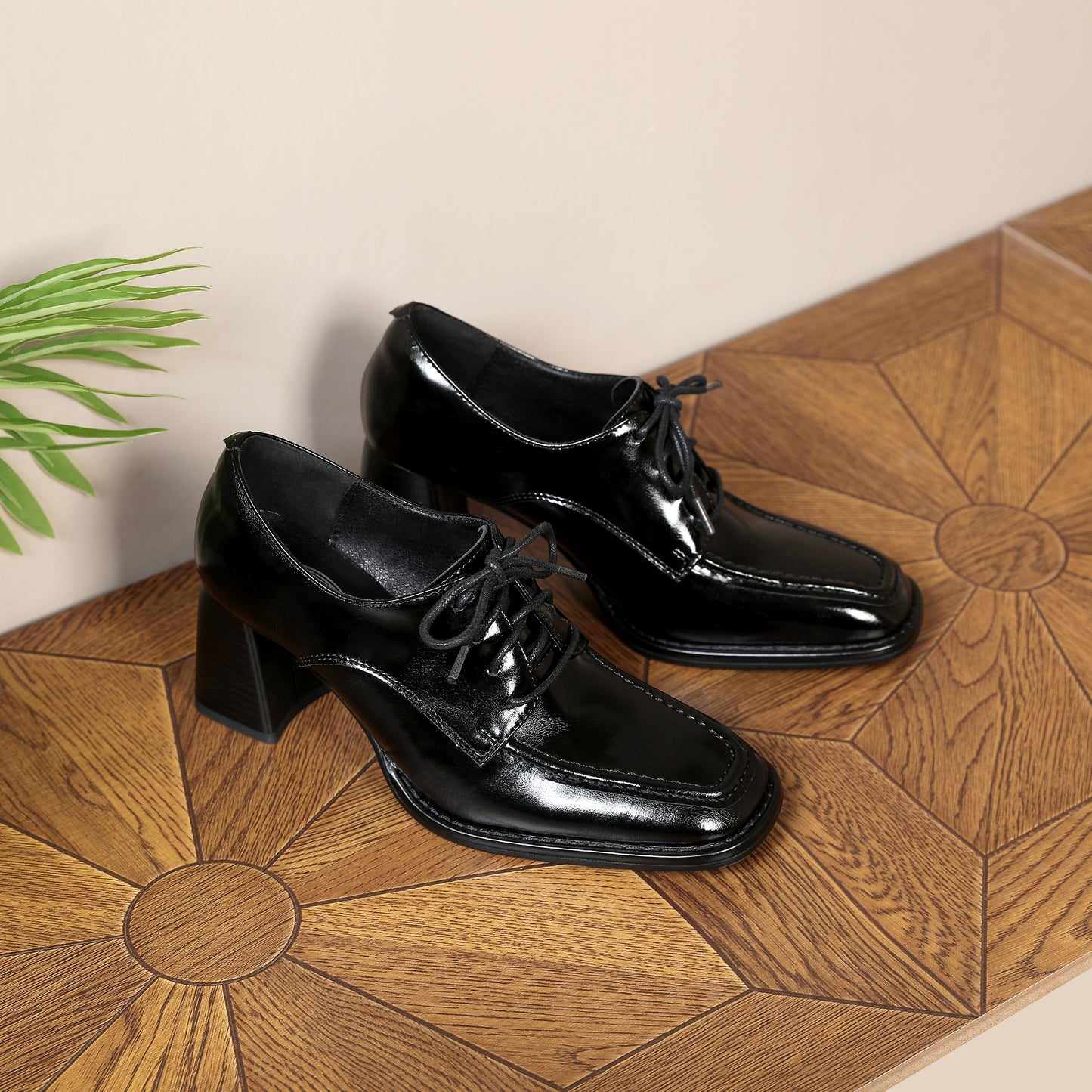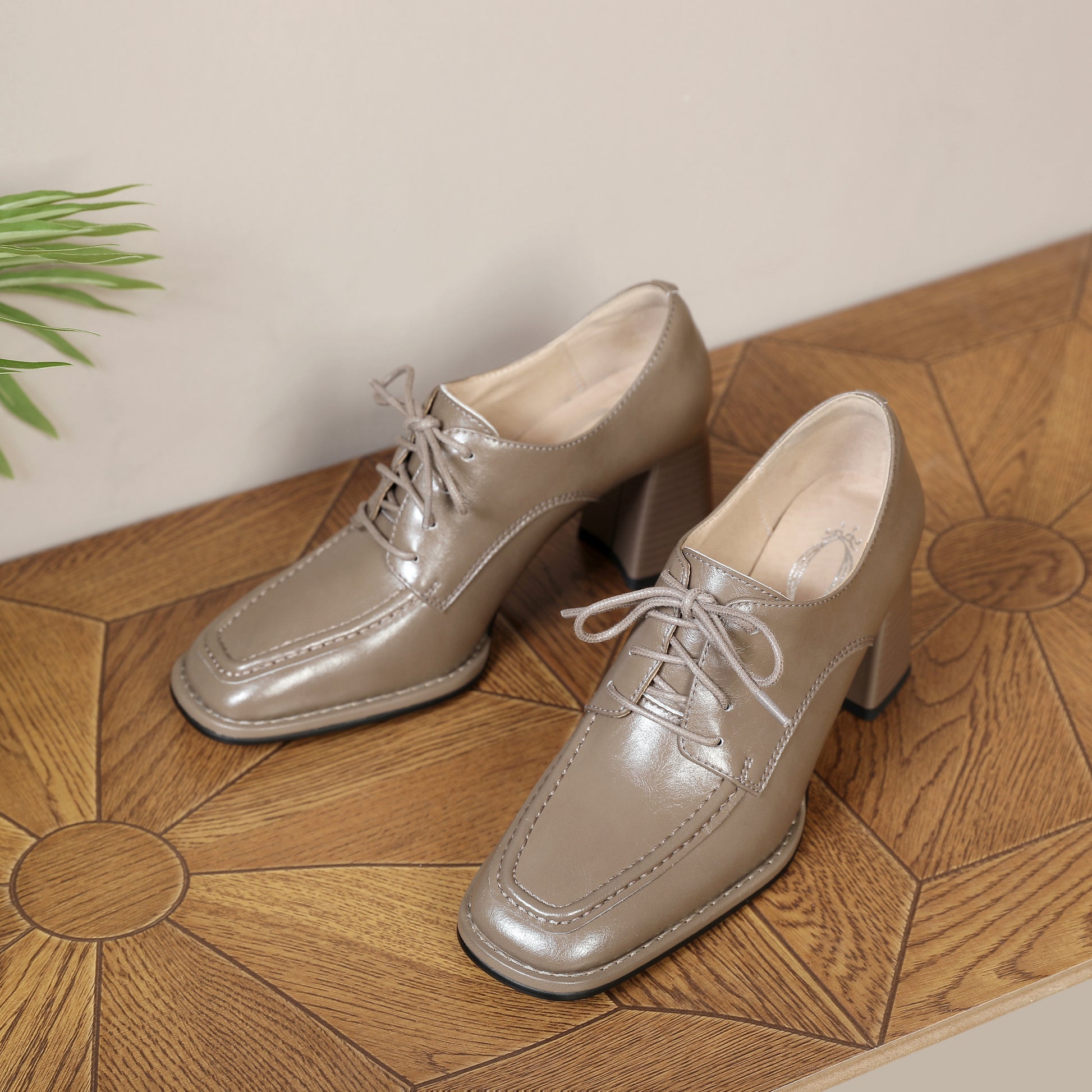 Genuine leather pumps shoes designed with square toe, lace up and chunky heels to keep up with fashion trend.