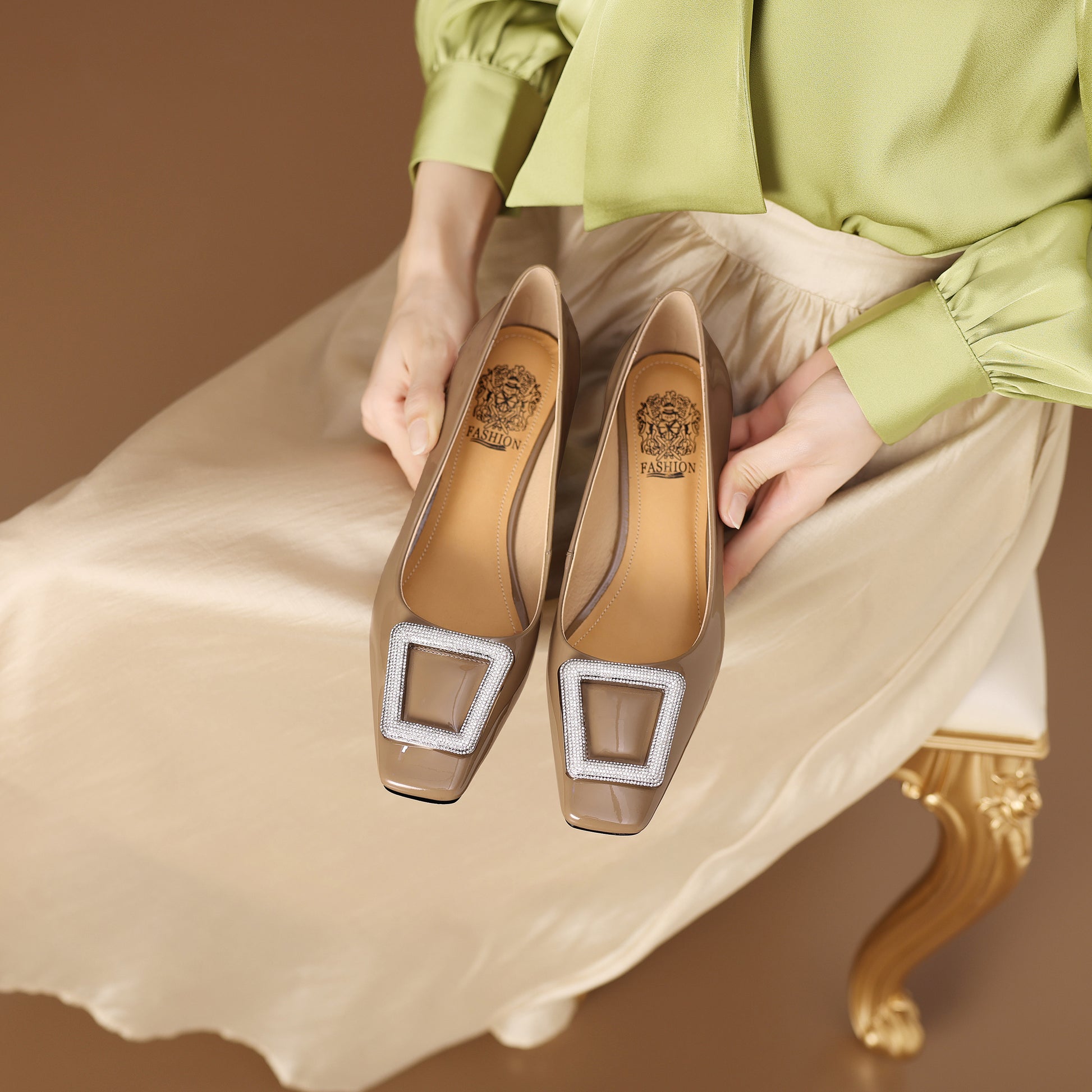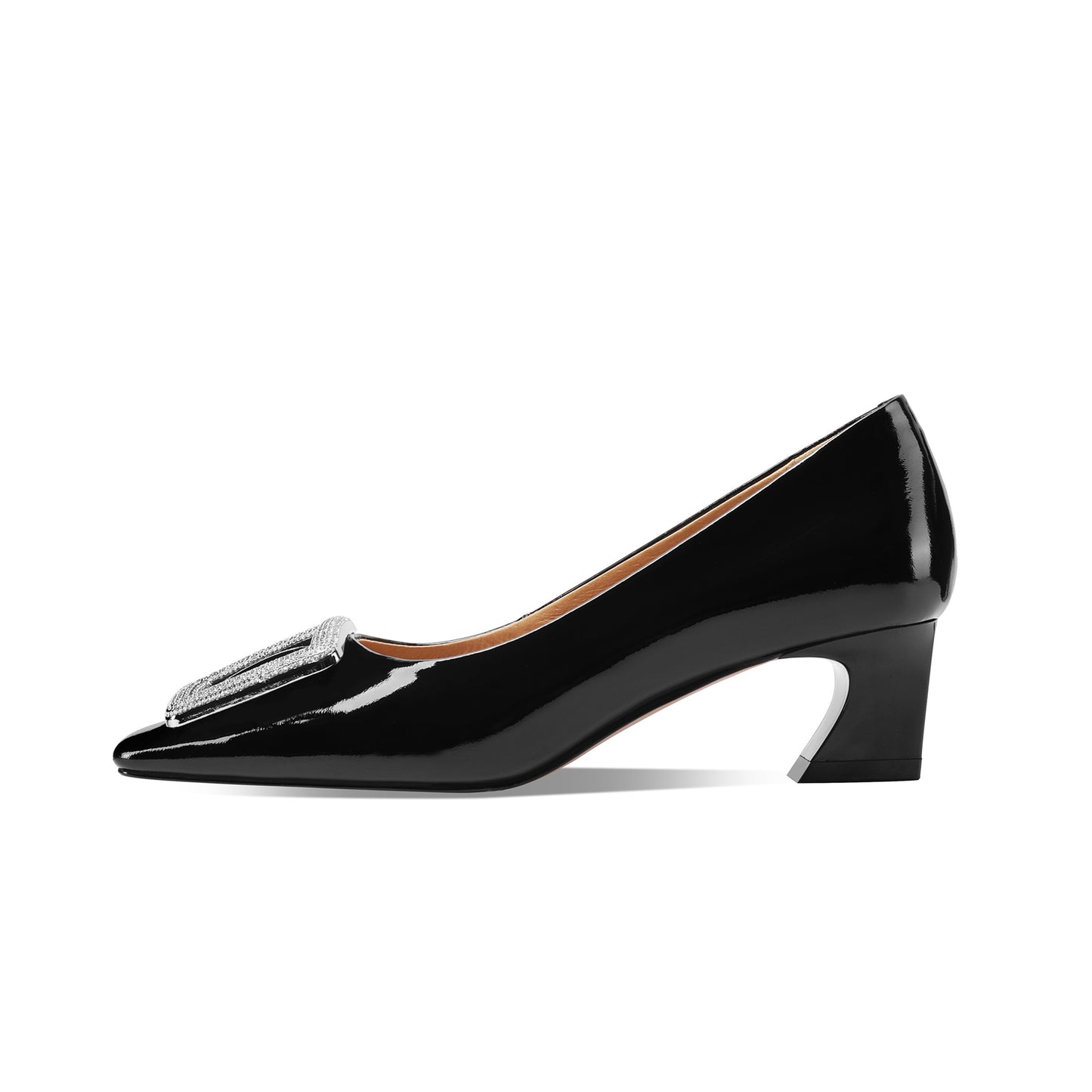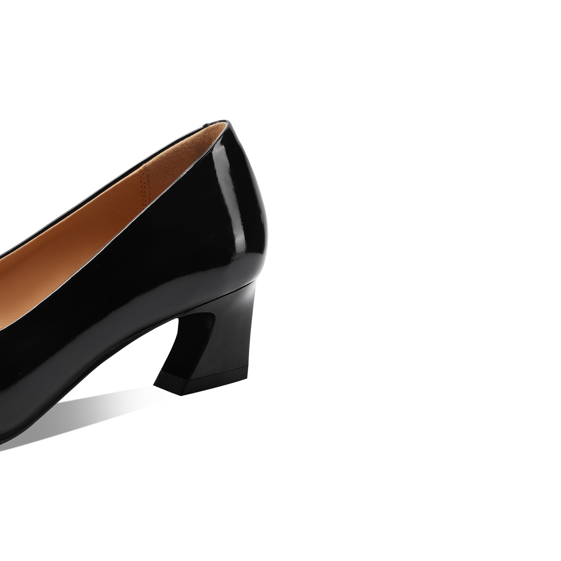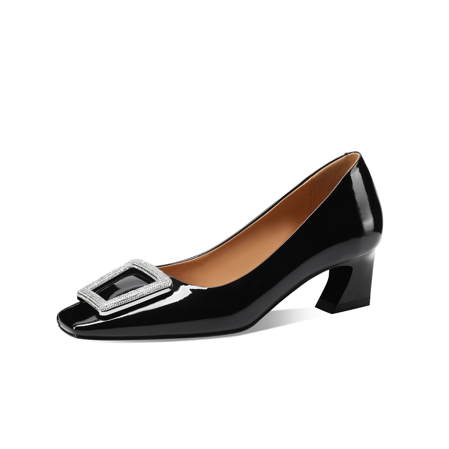 Pumps shoes with patent leather, slip on and square toe can go with your dress, jeans and pants.