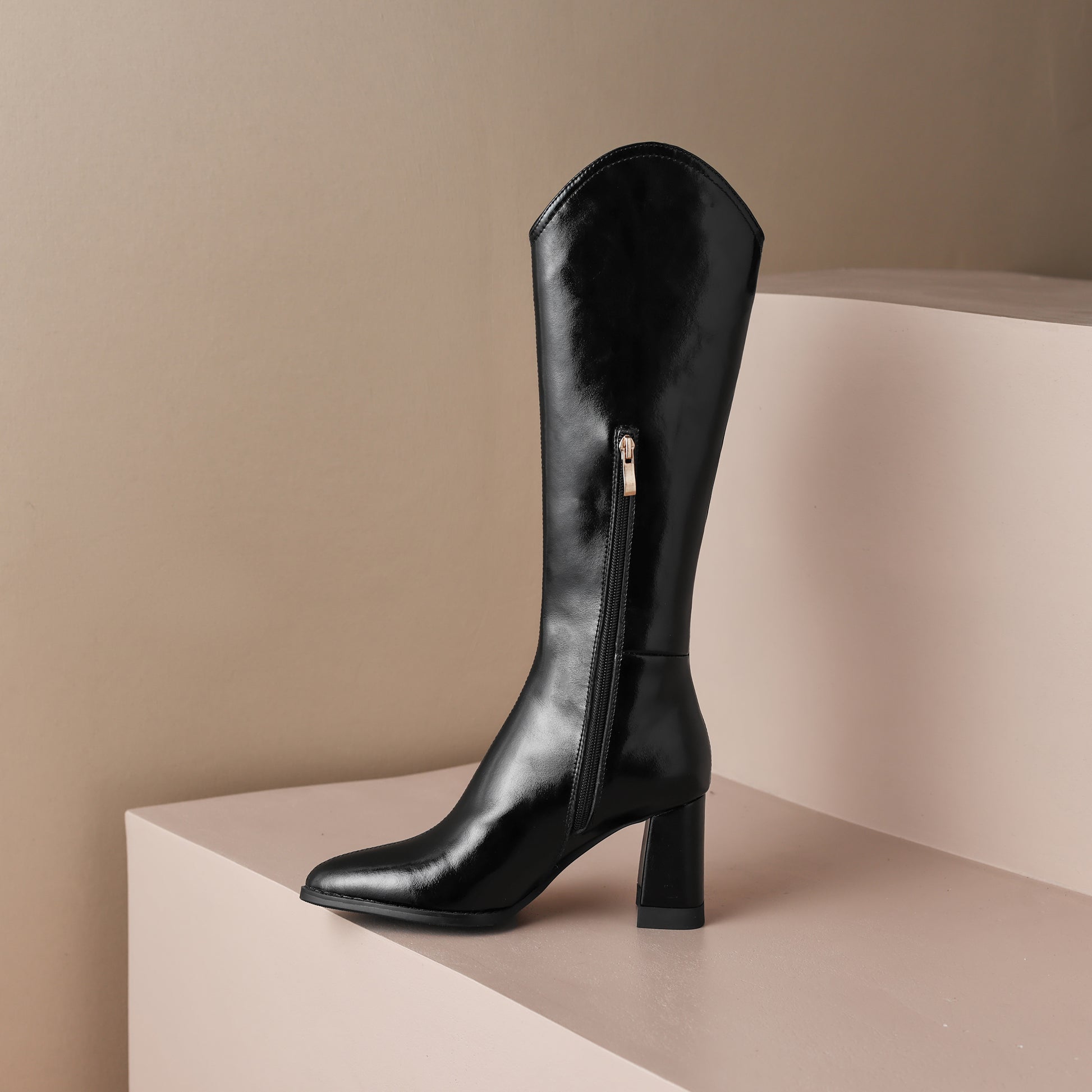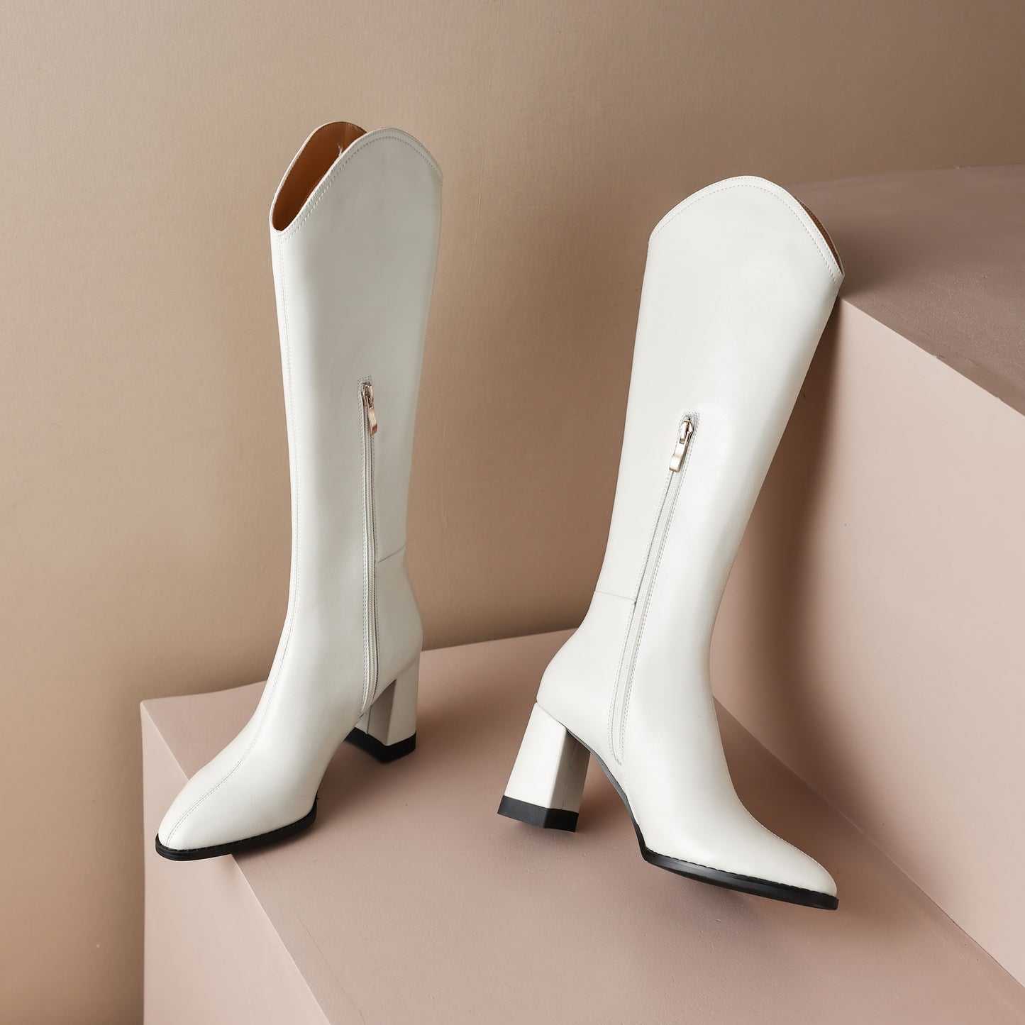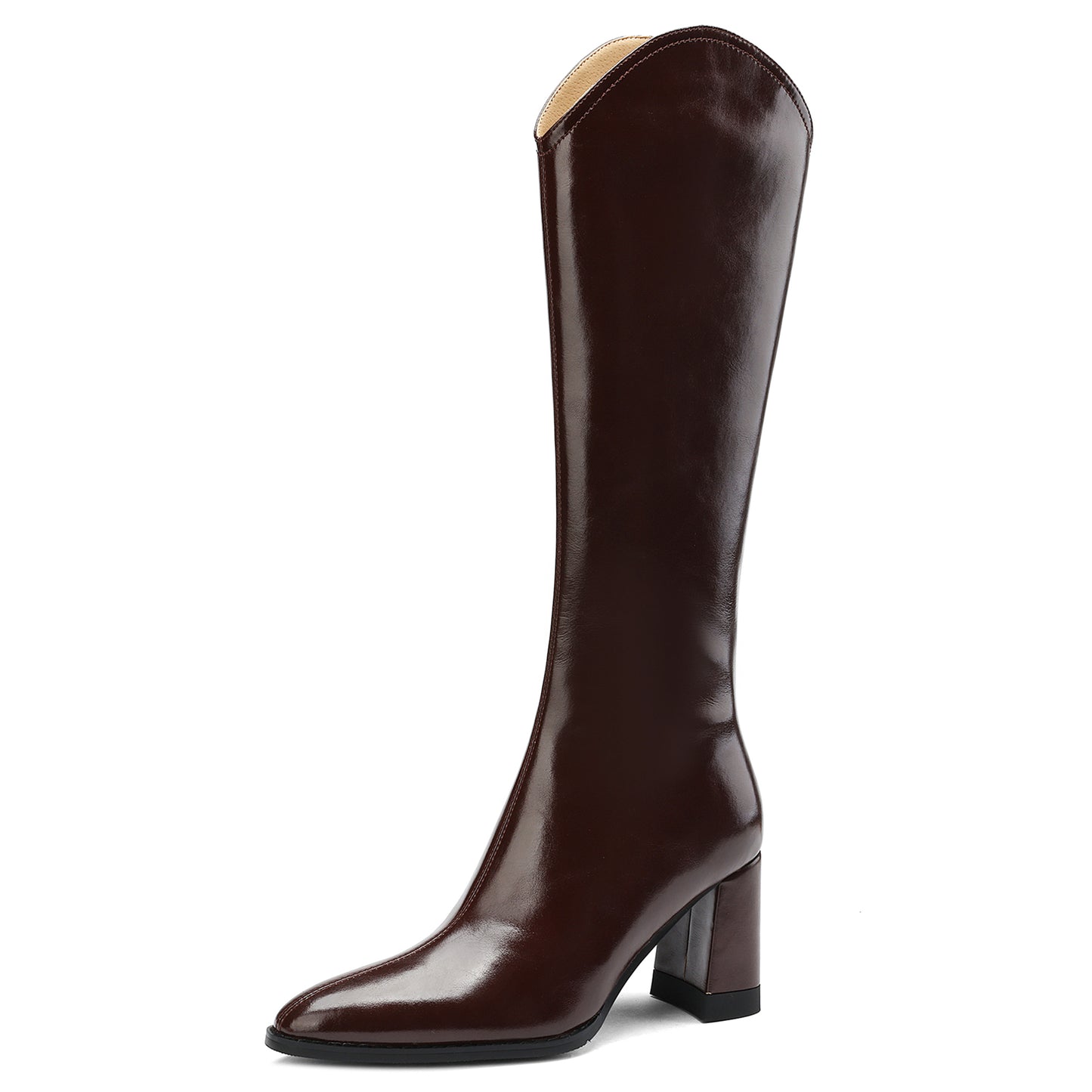 TinaCus Handmade Women's Genuine Leather Pointed Toe Half Zip Chunky Heel Knee High Boots