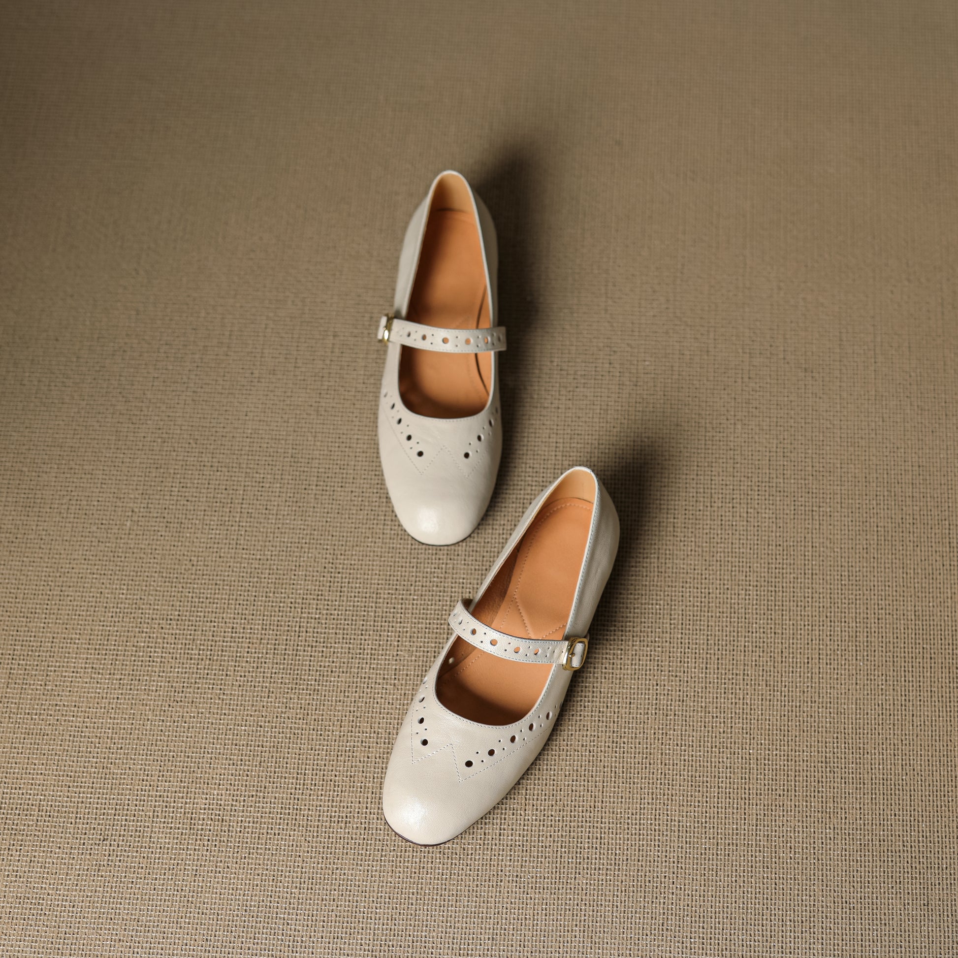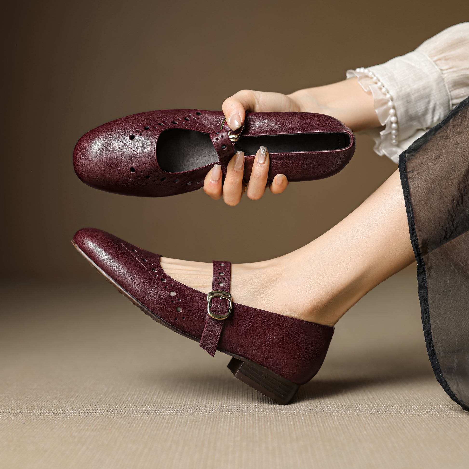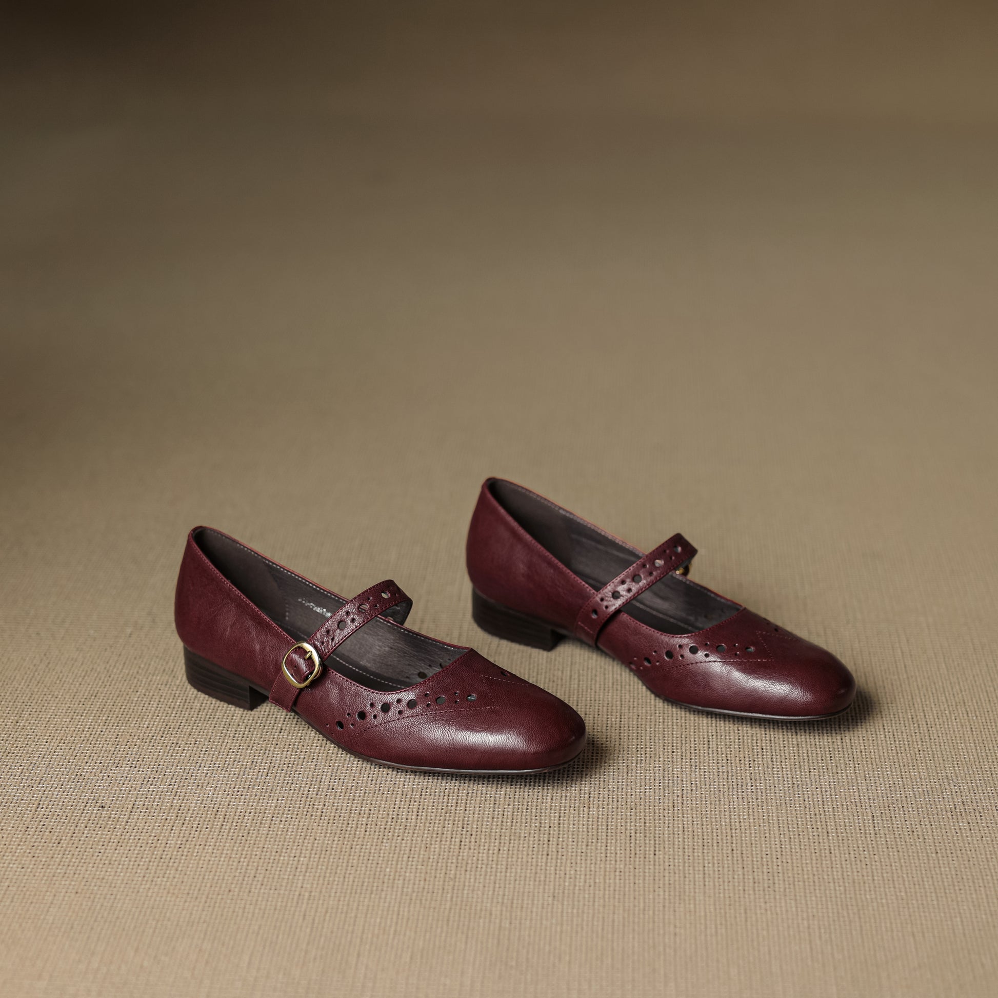 TinaCus Handmade Women's Genuine Leather Round Toe Perforated Ballet Flats with Adjustable Buckle