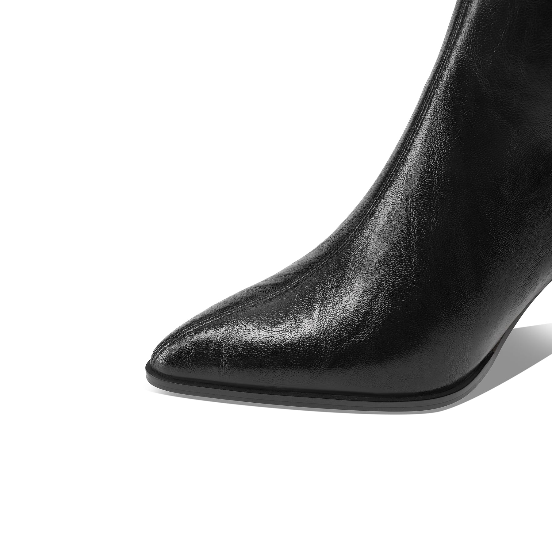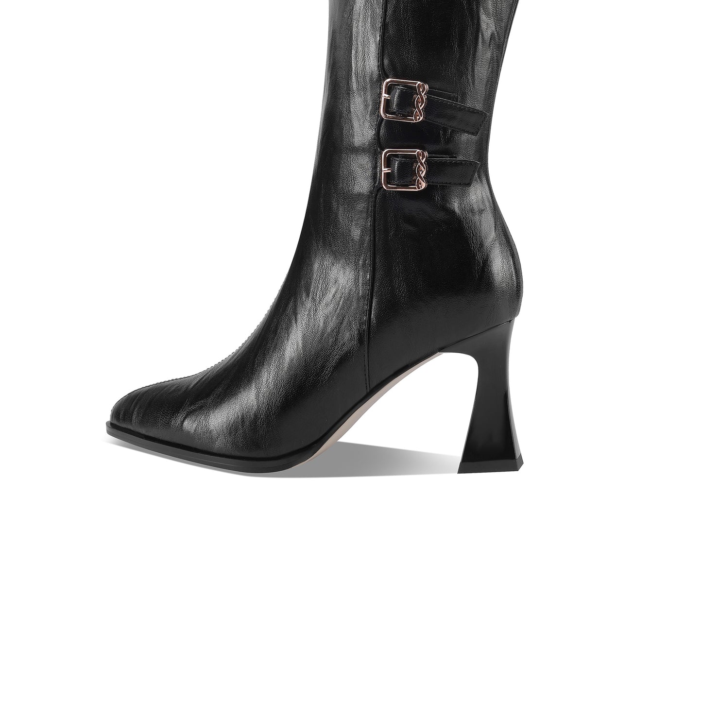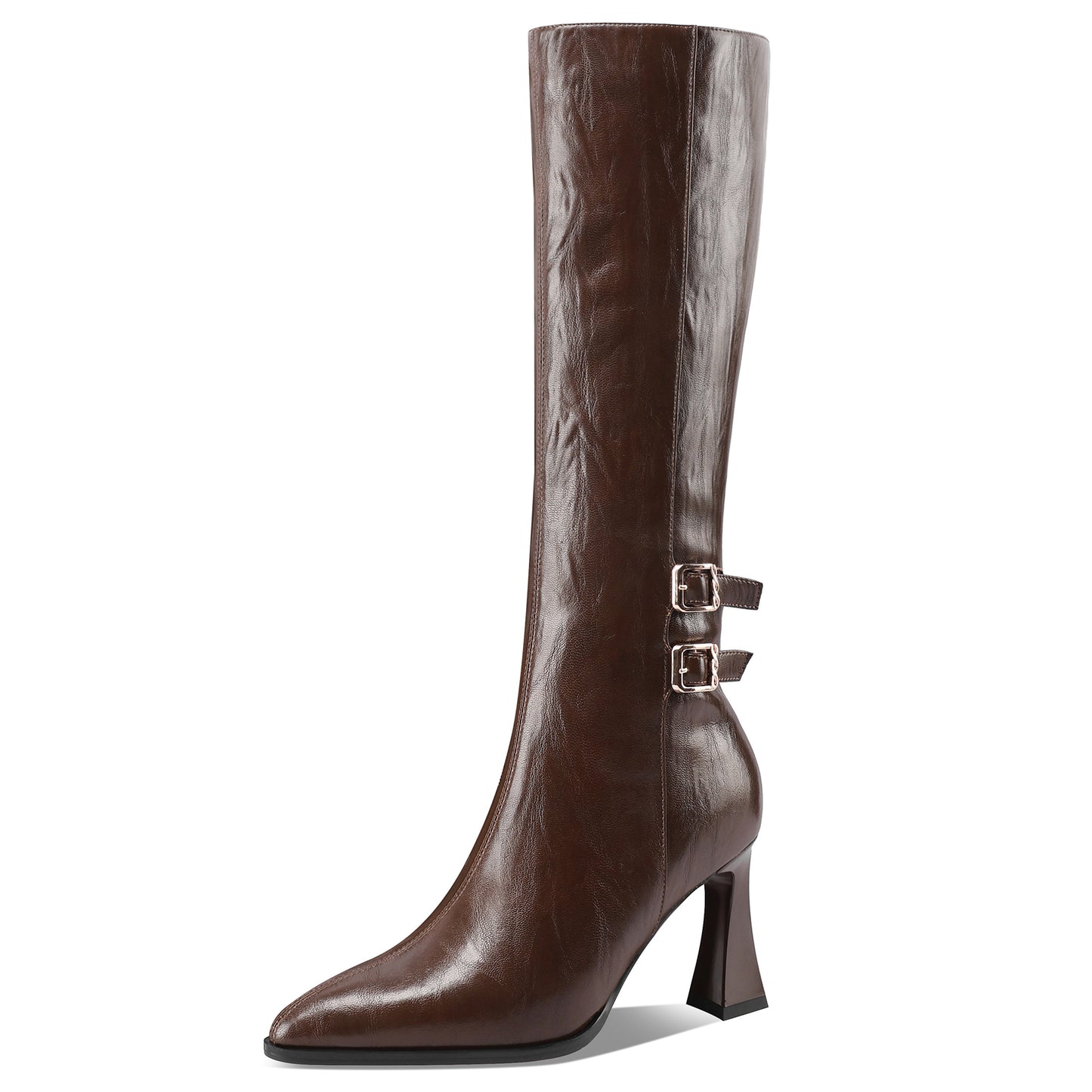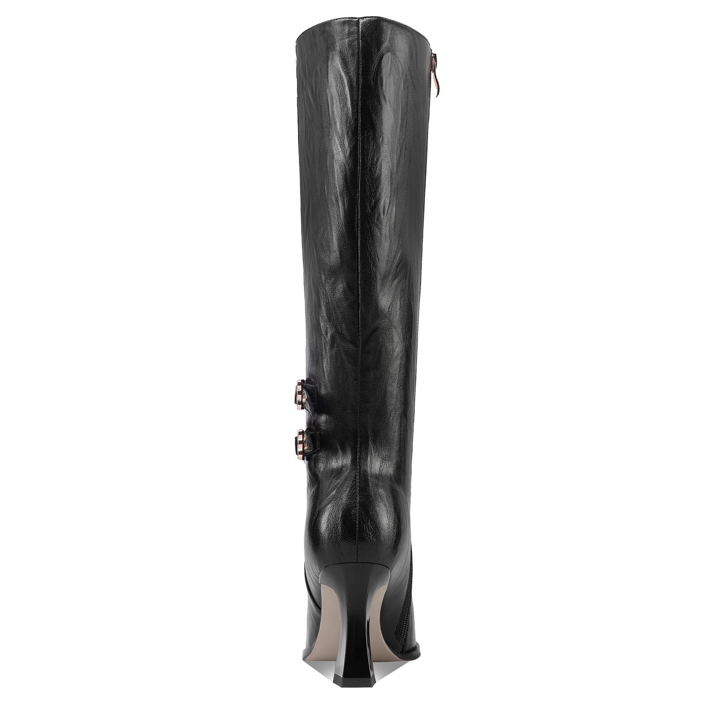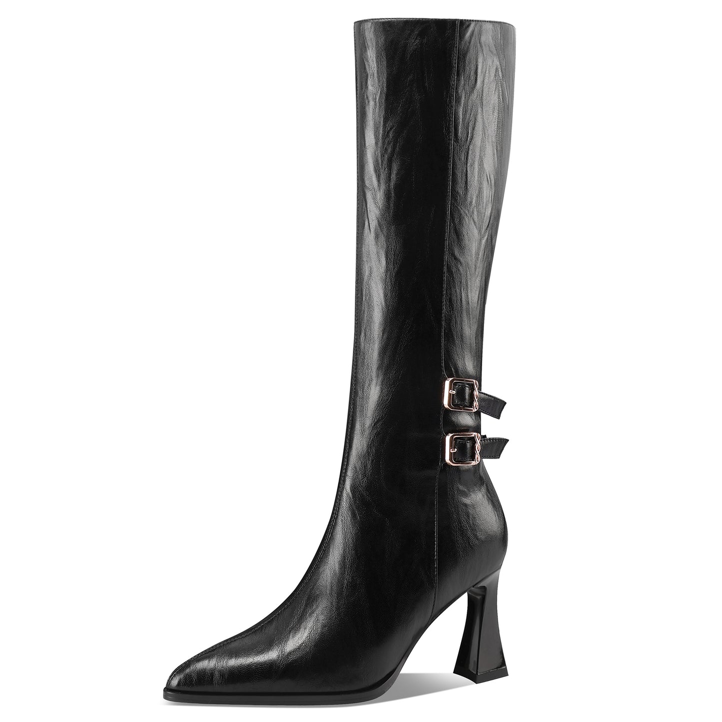 TinaCus Handmade Women's Genuine Leather Side Zip Up Pointed Toe High Heel Buckles Knee High Boots