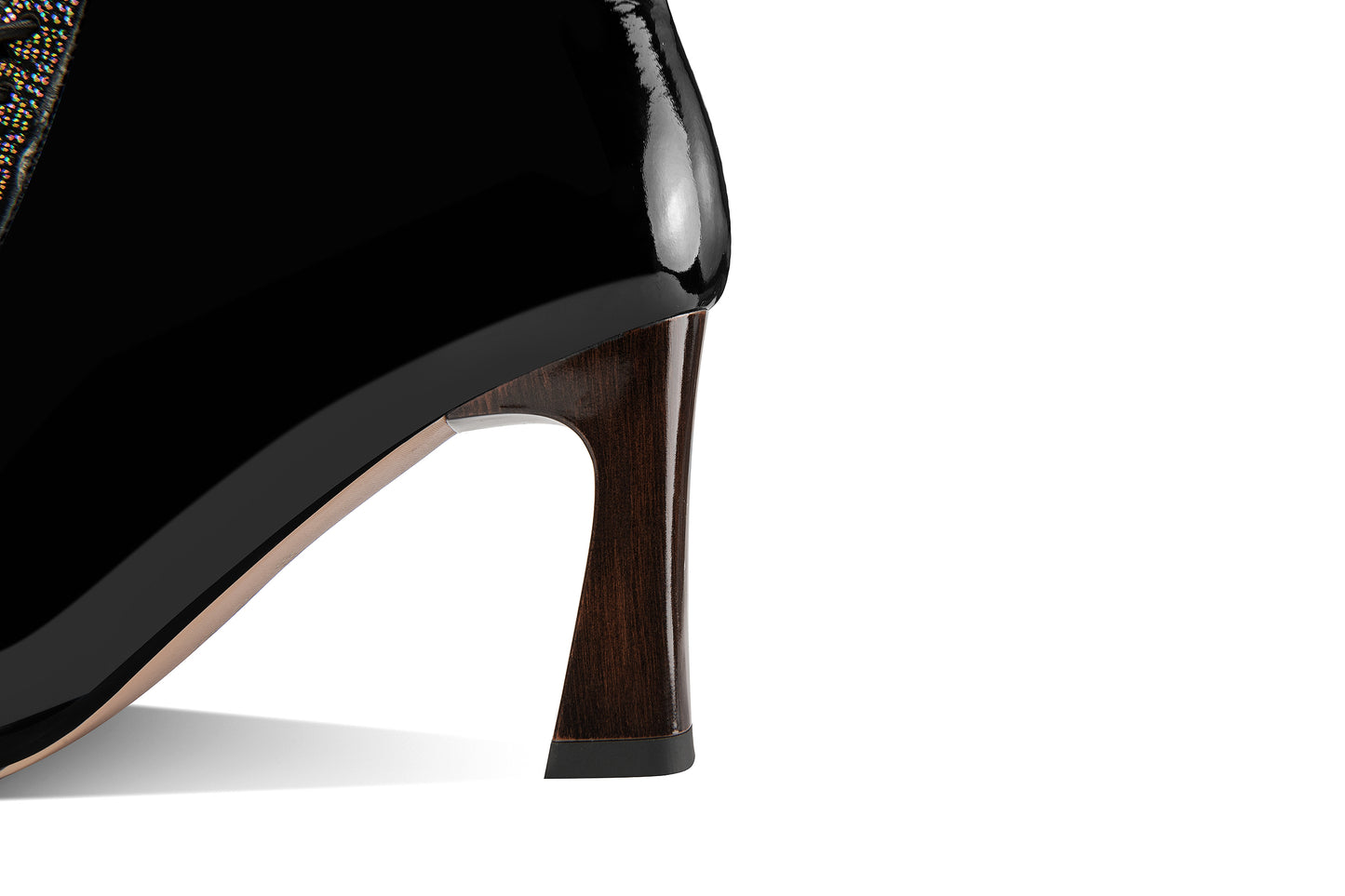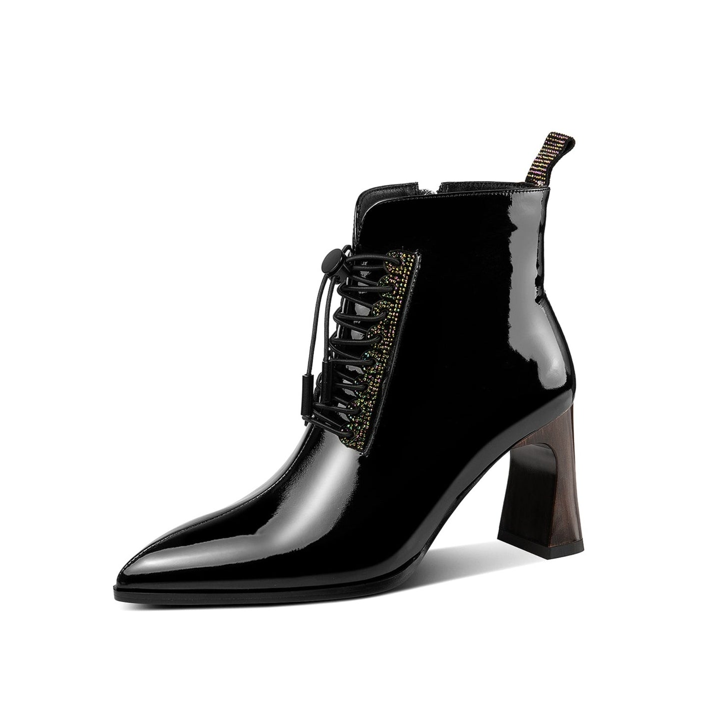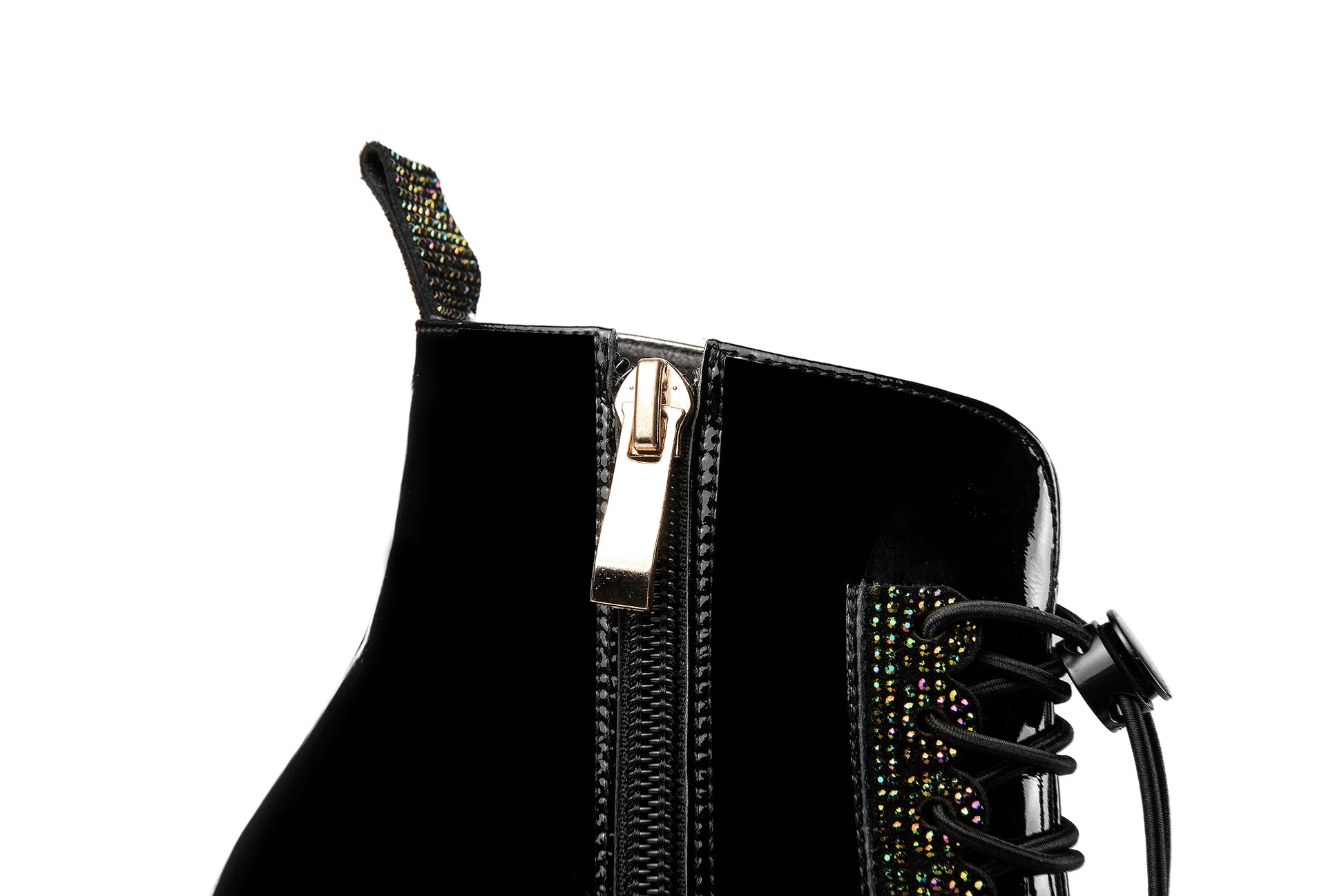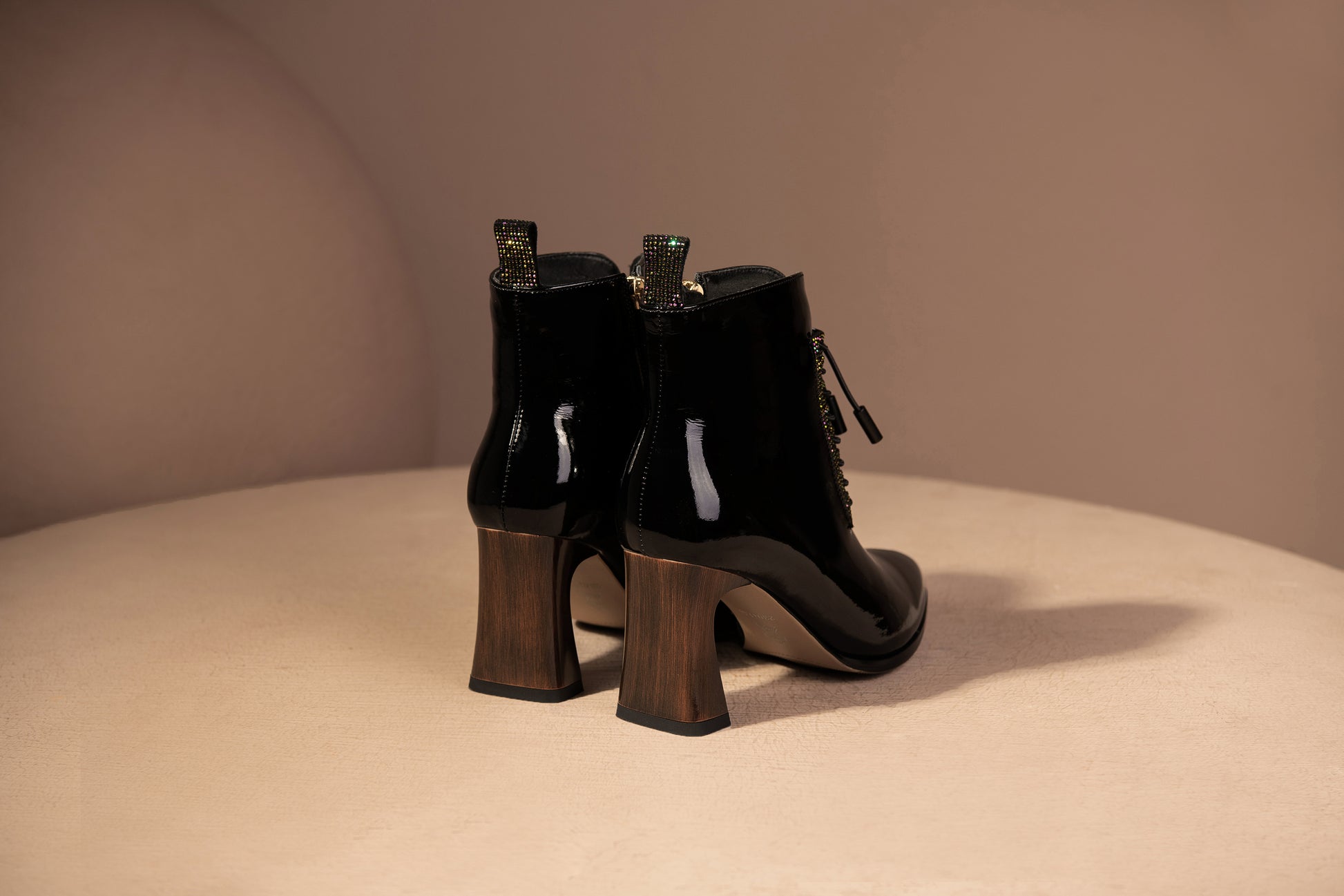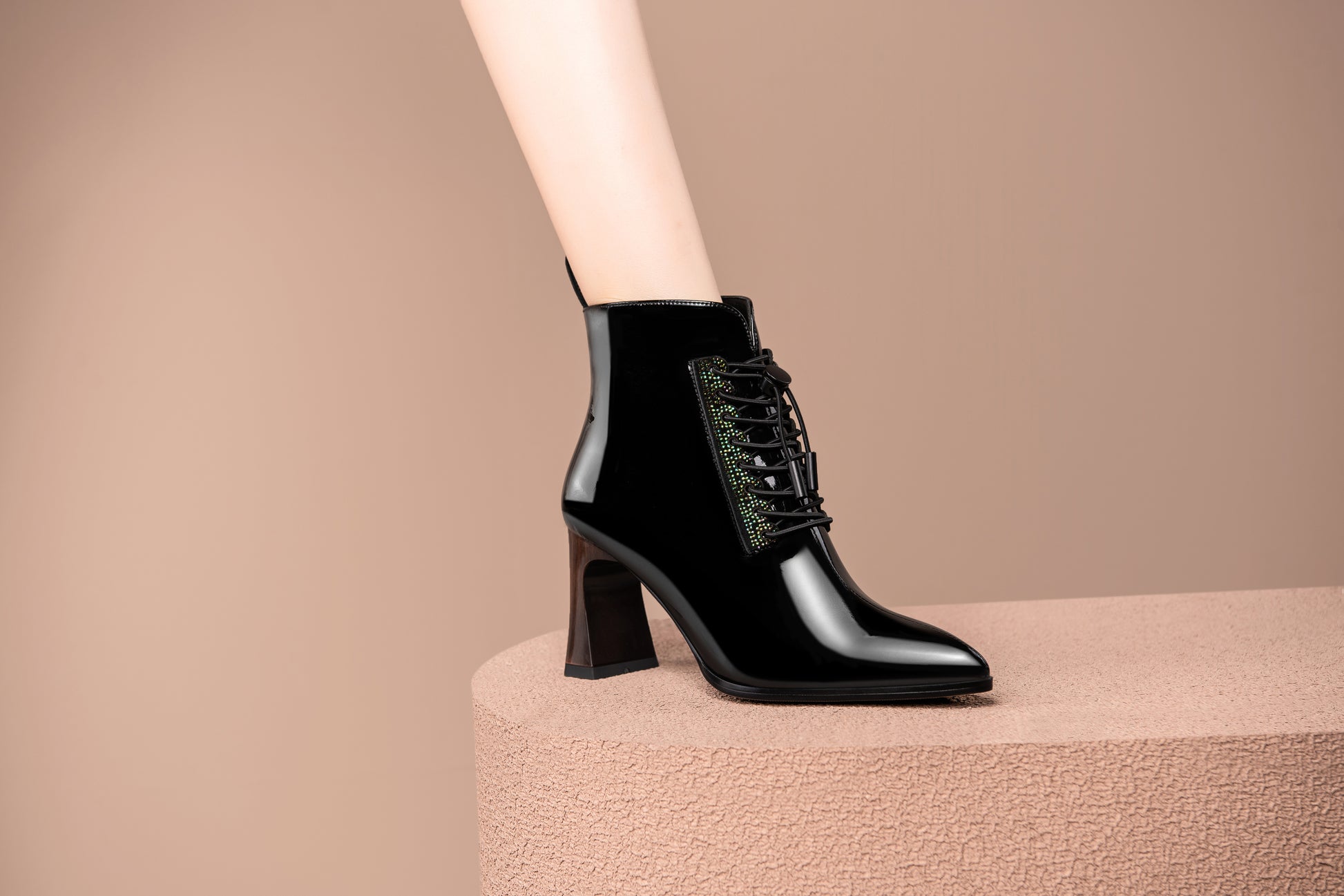 TinaCus Handmade Women's Patent Leather Rhinestones Front Lace Up Pointed Toe Mid Chunky Heel Ankle Boots