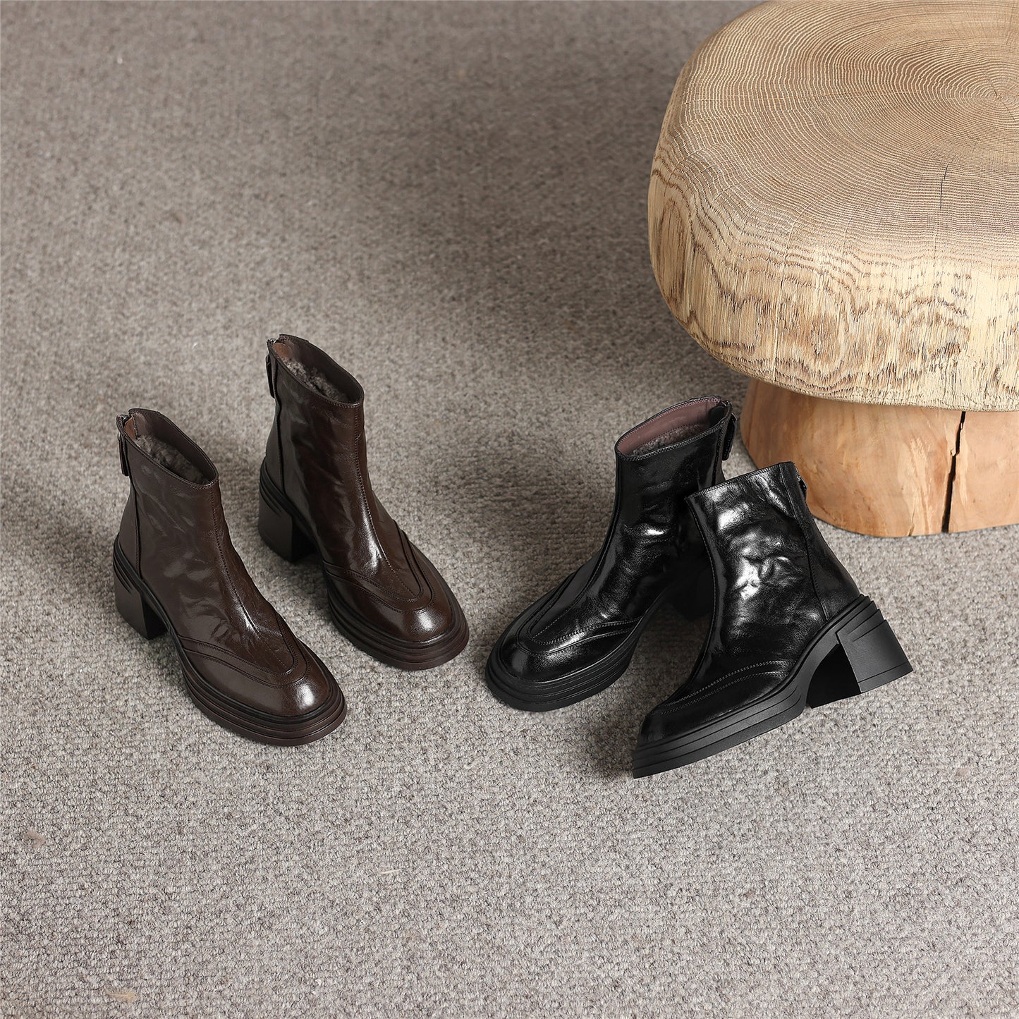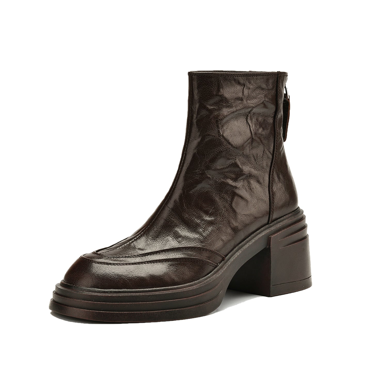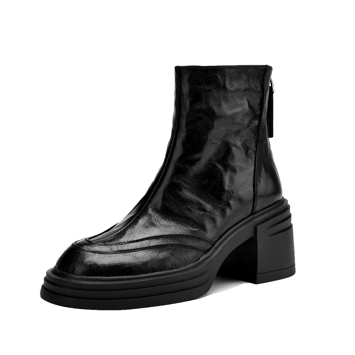 Ankle boots are designed with round toe, genuine leather, zip and block heel.
