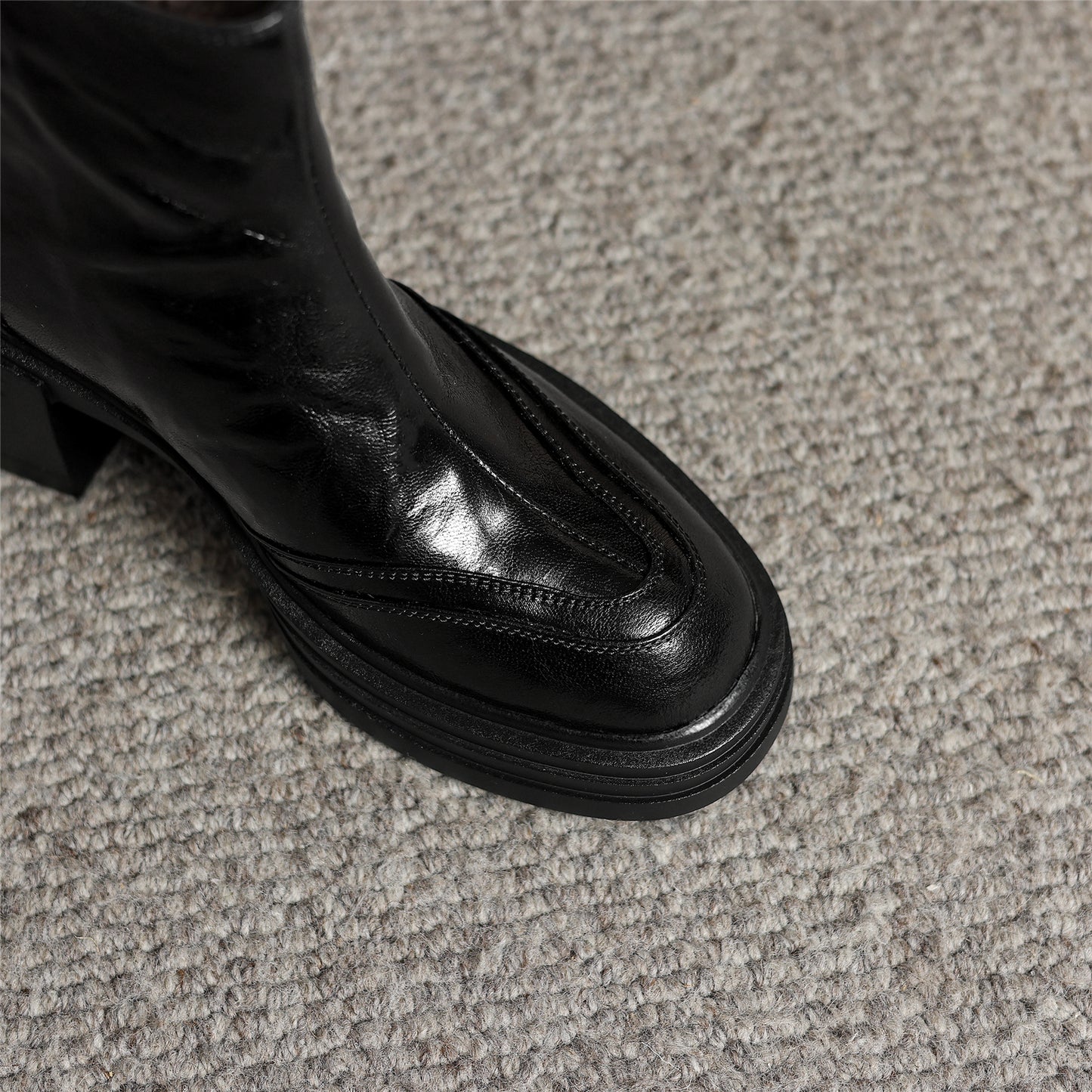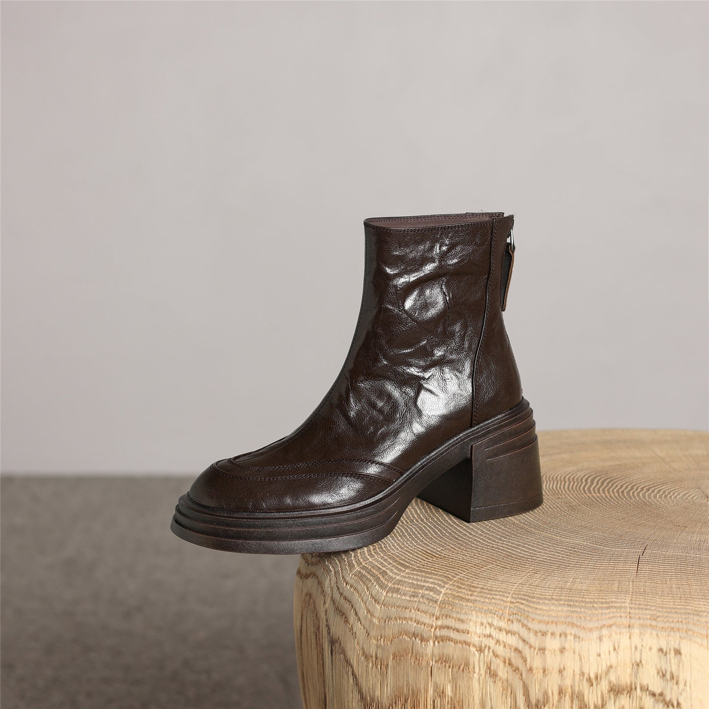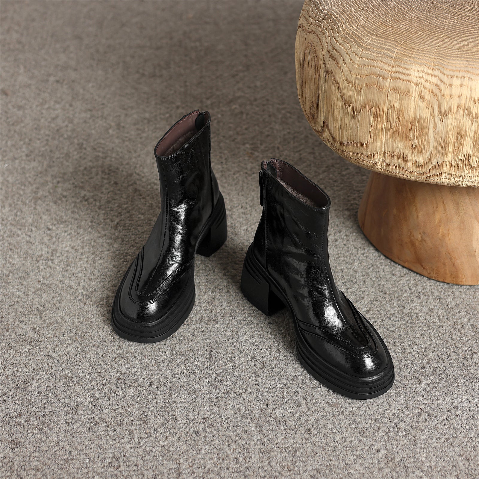 Ankle boots are designed with round toe, genuine leather, zip and block heel.
