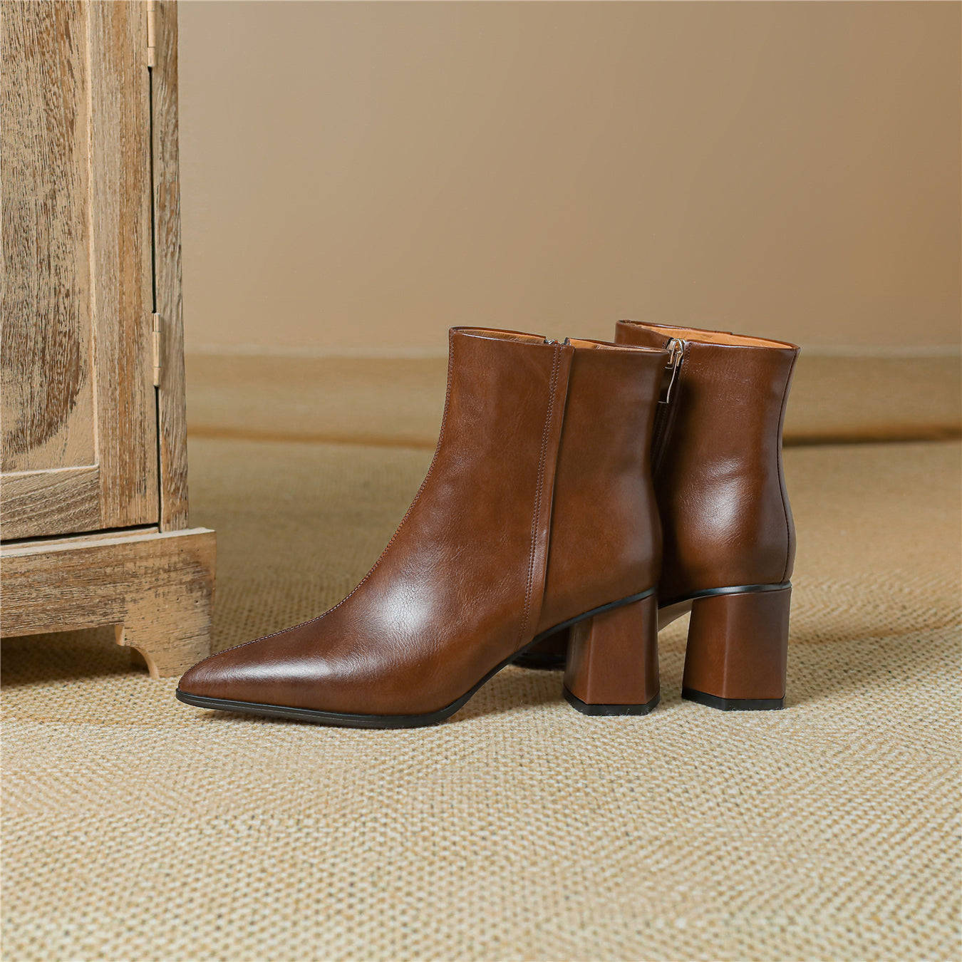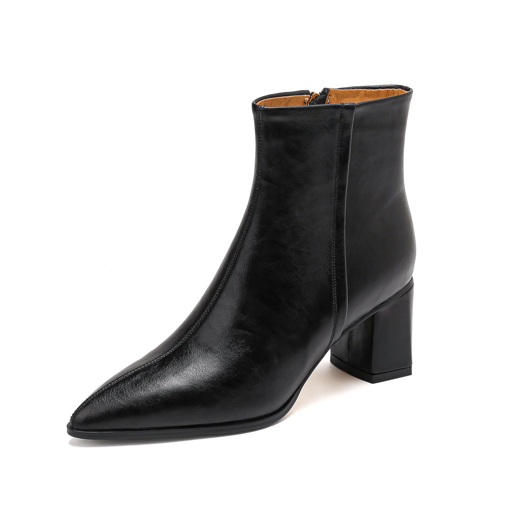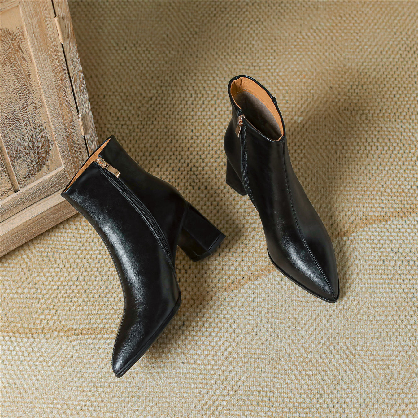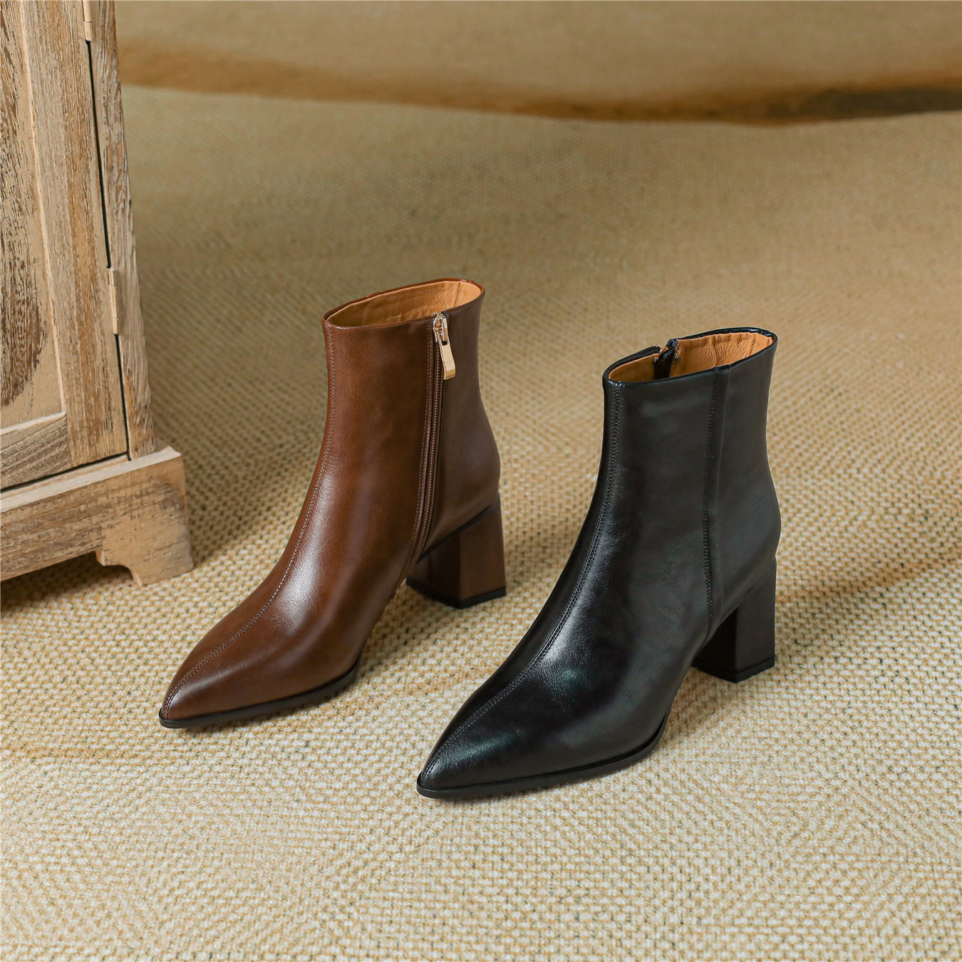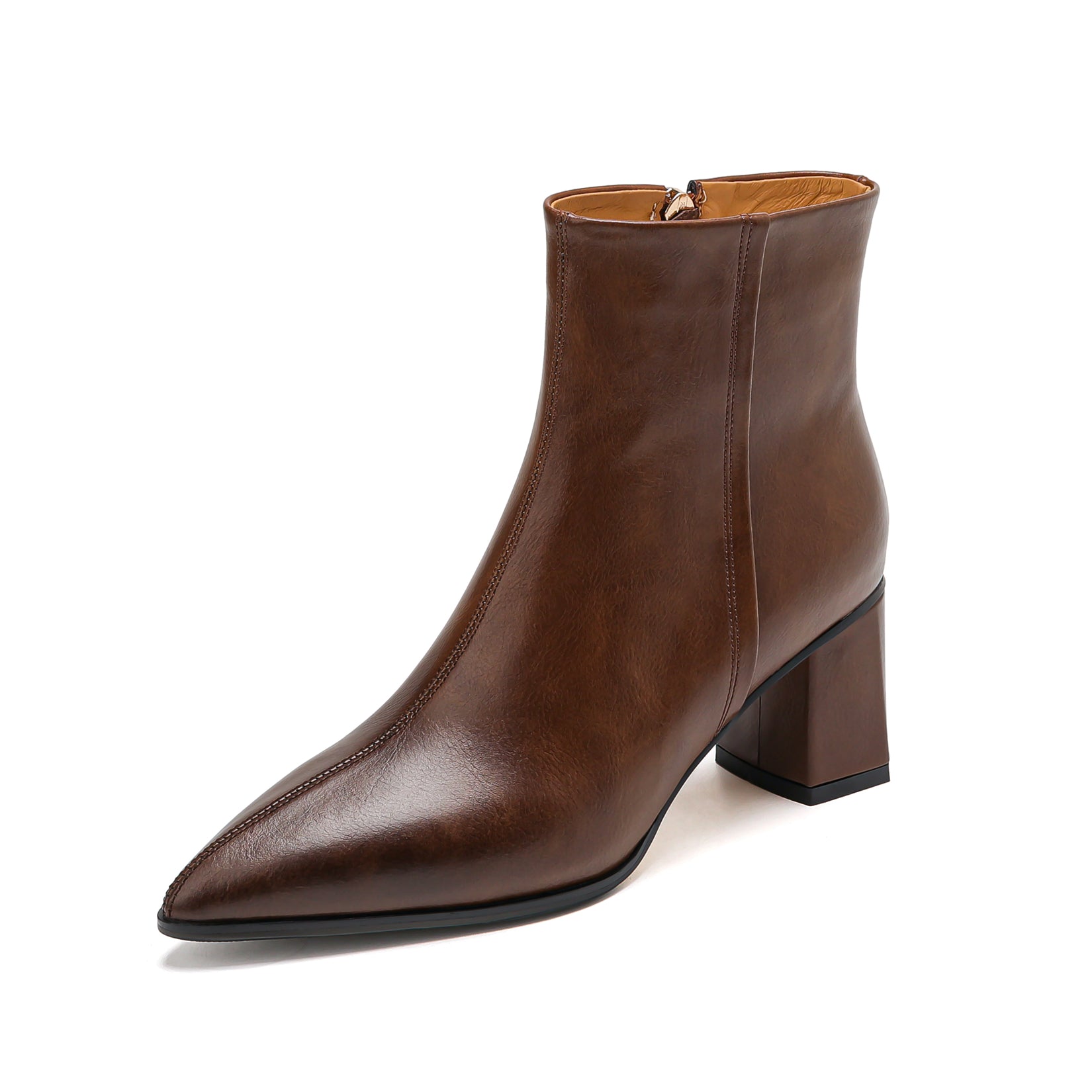 Ankle boots are designed with pointed toe, genuine leather, zip and mid heel.