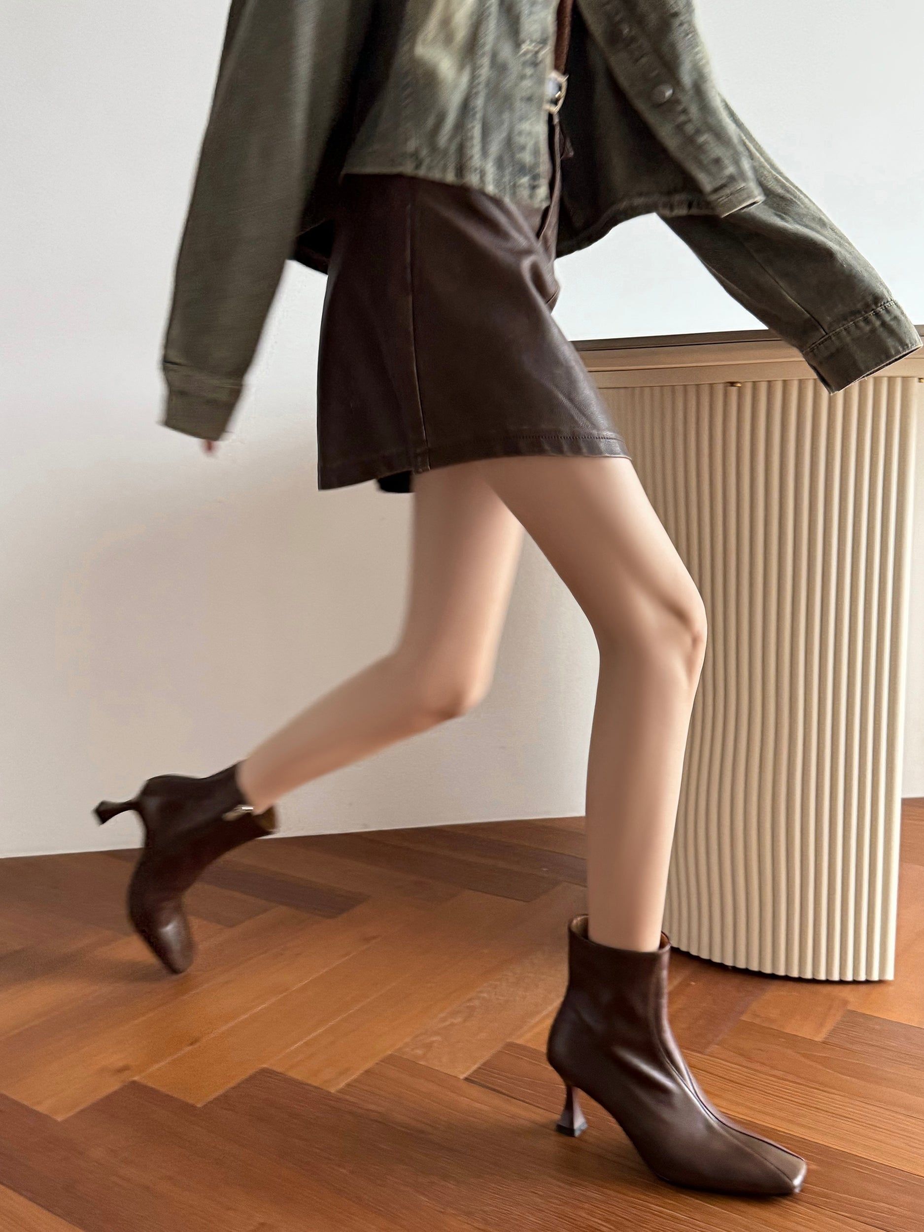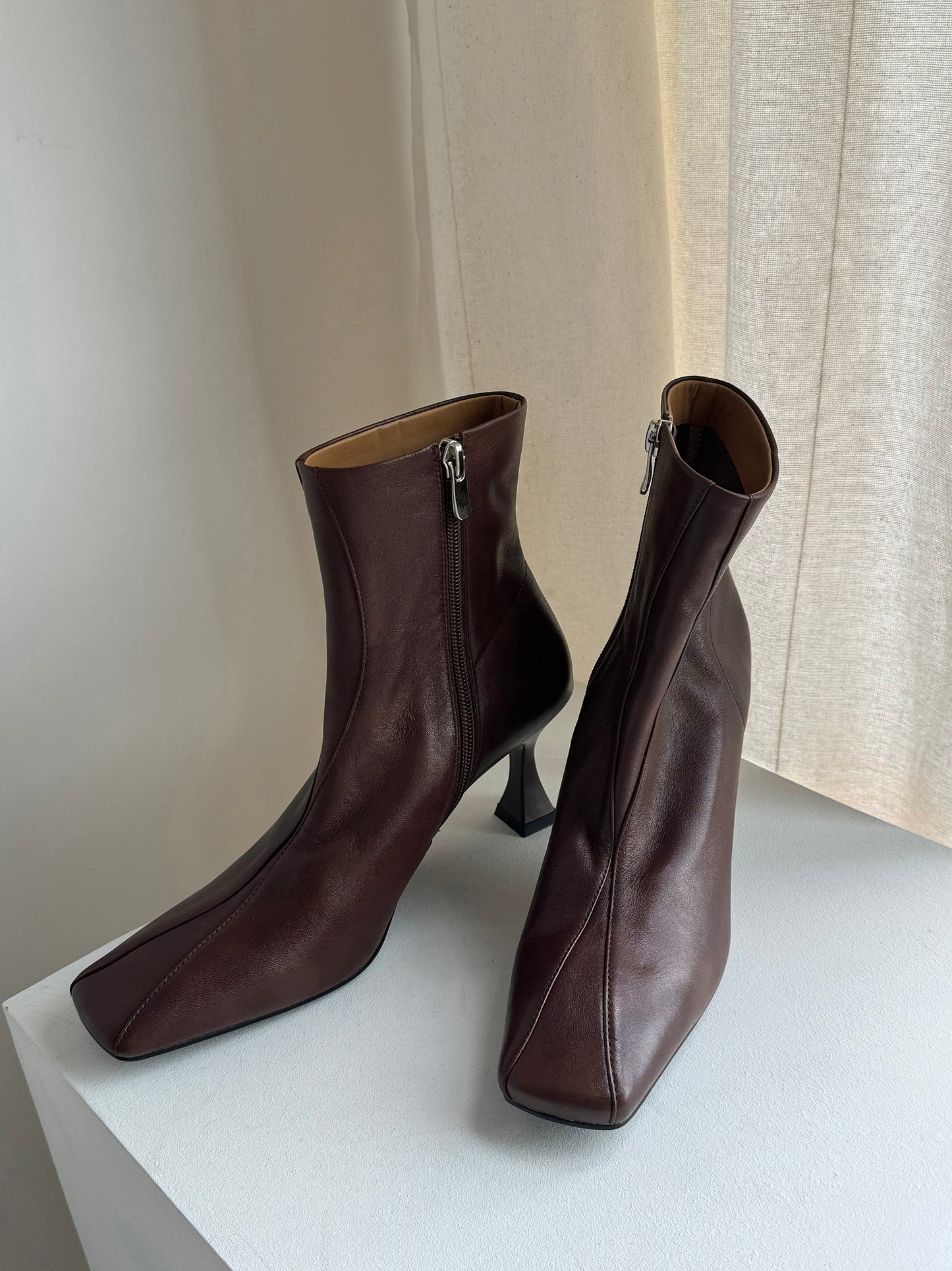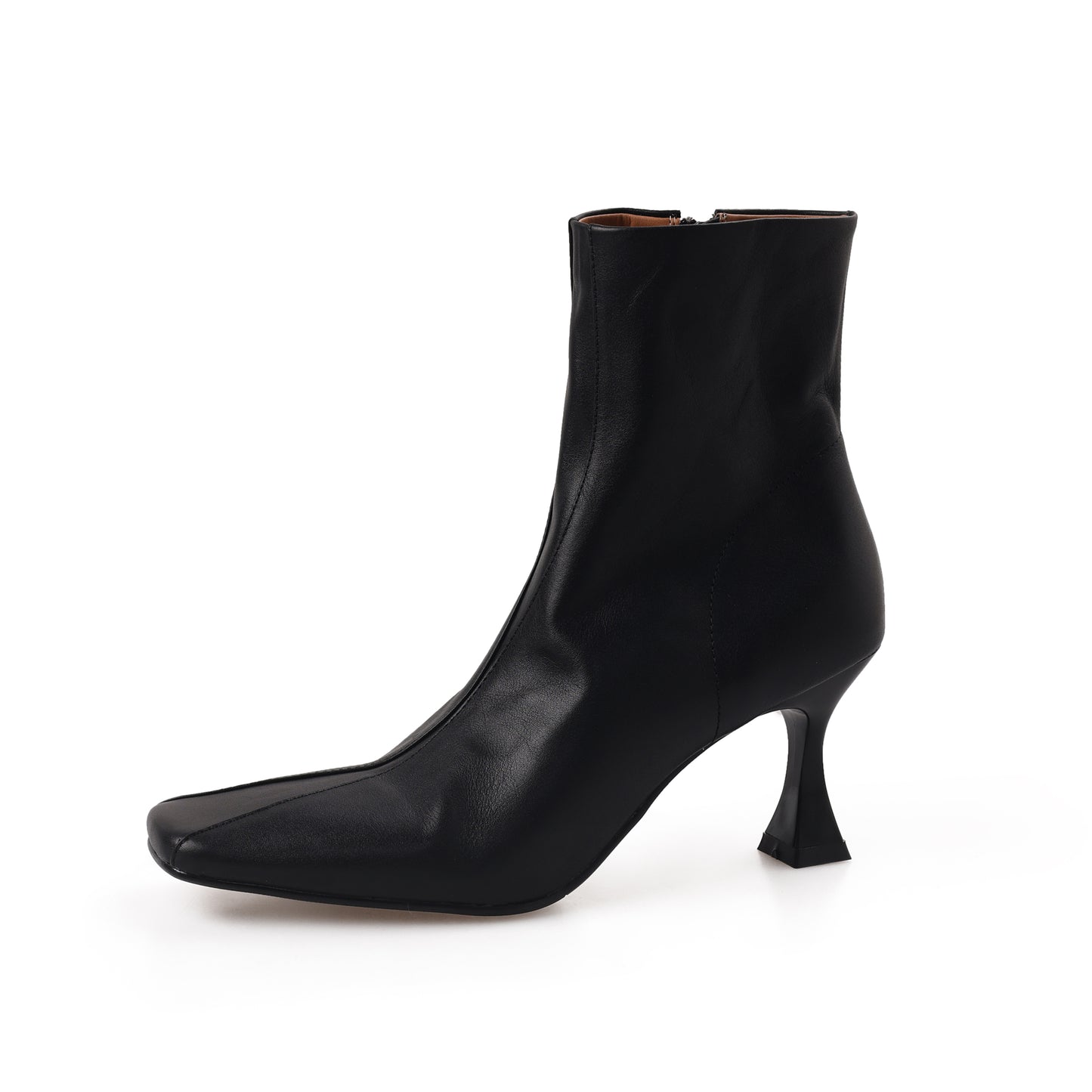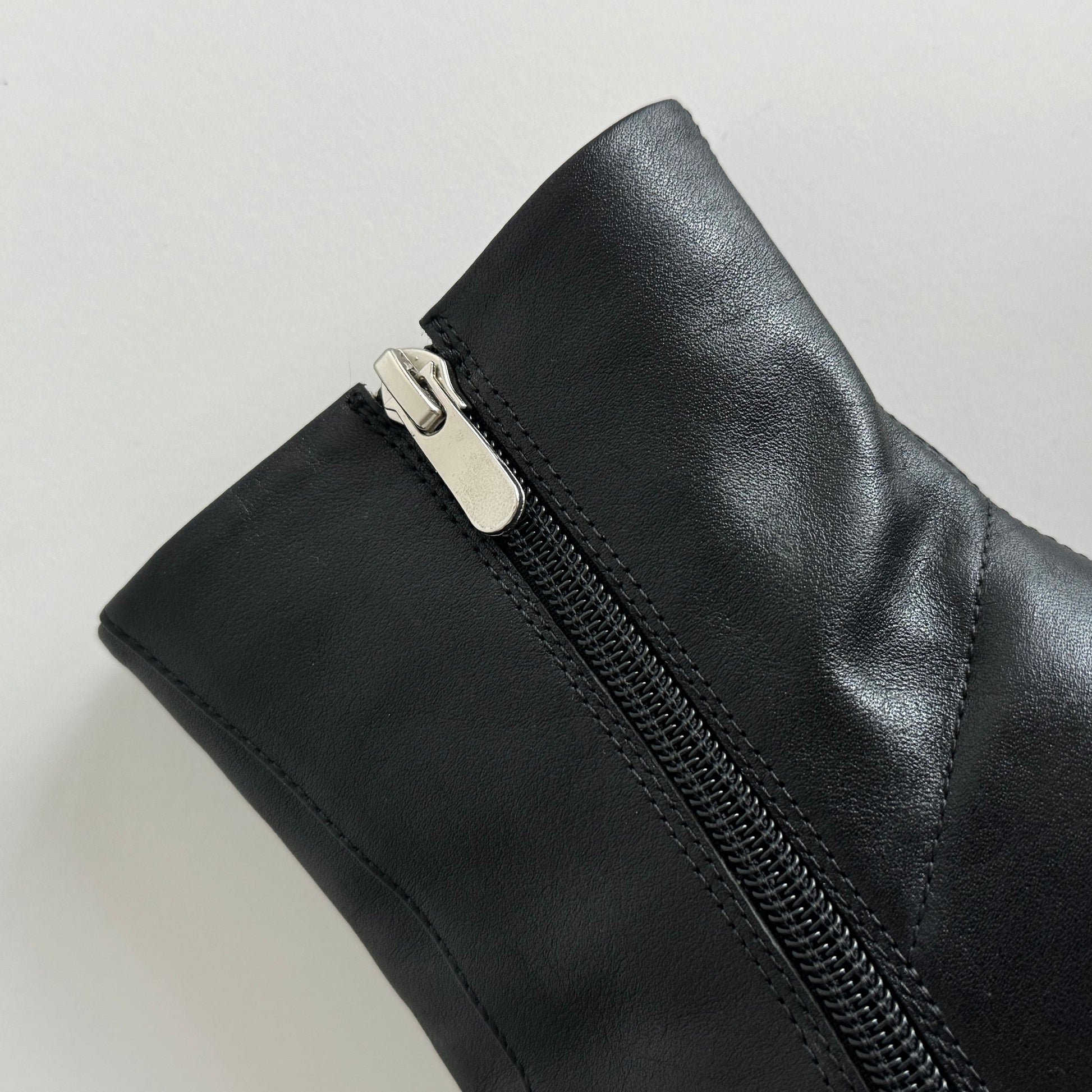 Ankle boots are designed with genuine leather, high heel, square toe and side zip up.